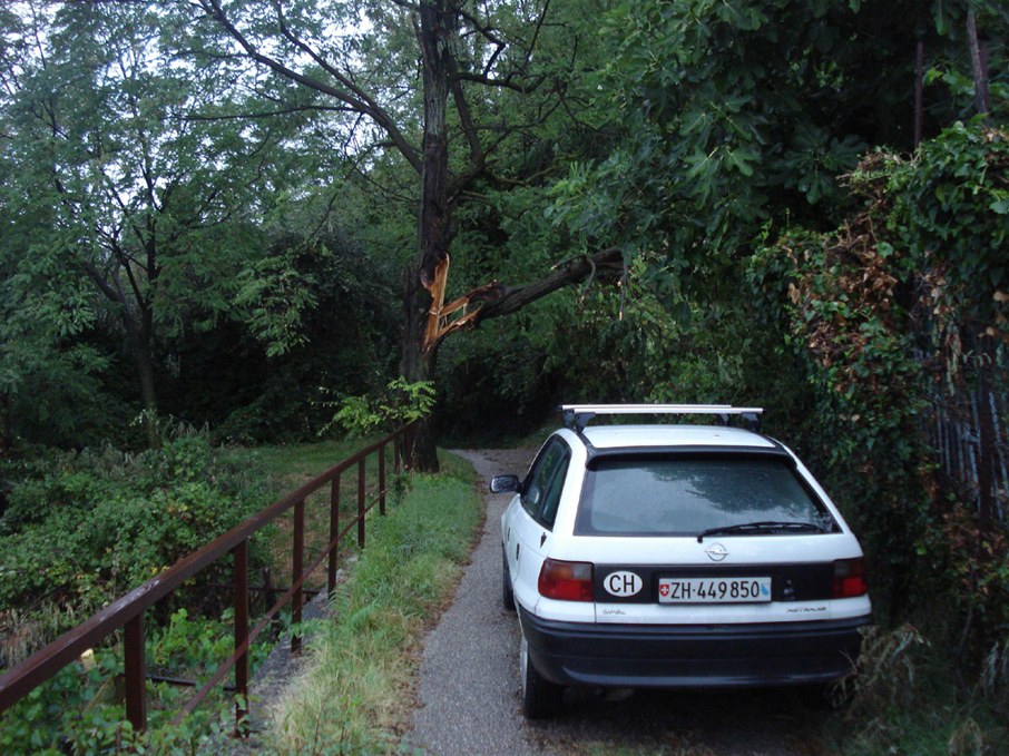 So ein Einschlag (wie unten) habe ich aus nächster Nähe (60 Meter) beim Bruderhaus in Winterthur (Sommer 2007) selber erlebt: