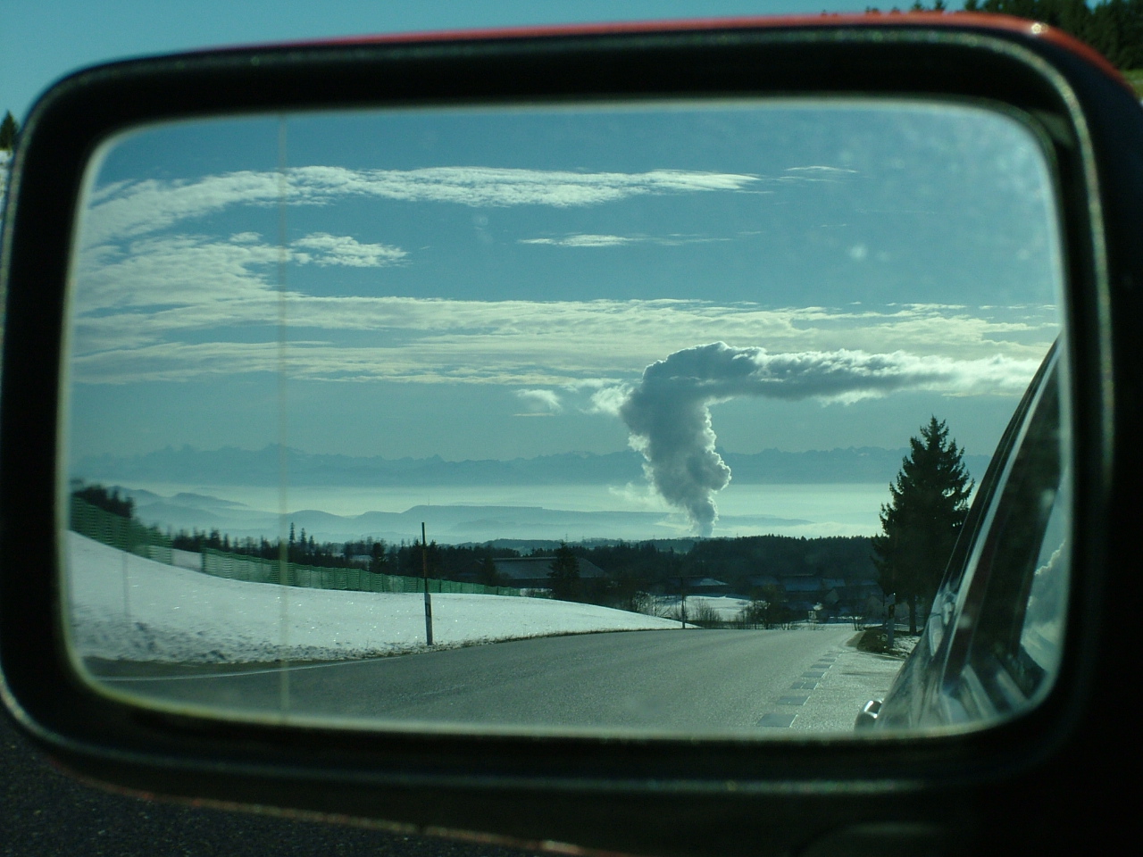 Blick bei der Fahrt zum Feldberg im Rückspiegel. Dampfwolke = KKL (Kernkraftwerk Leibstadt)