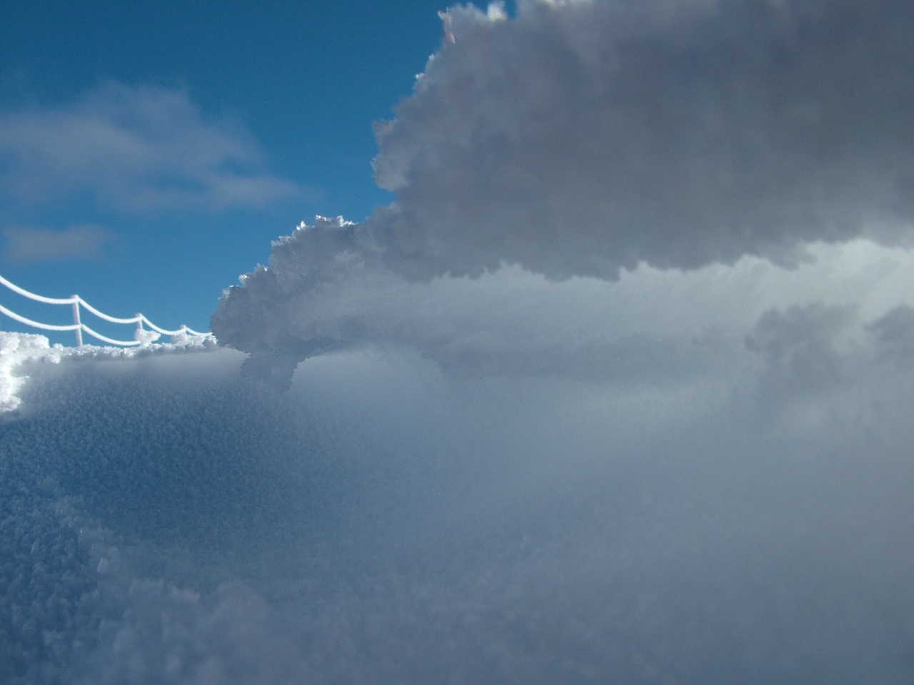 bizarre Eisskulpturen am Zaun bei der Station des DWD Feldberg. Blick Richtung SSW mit Alpen im Hintergrund