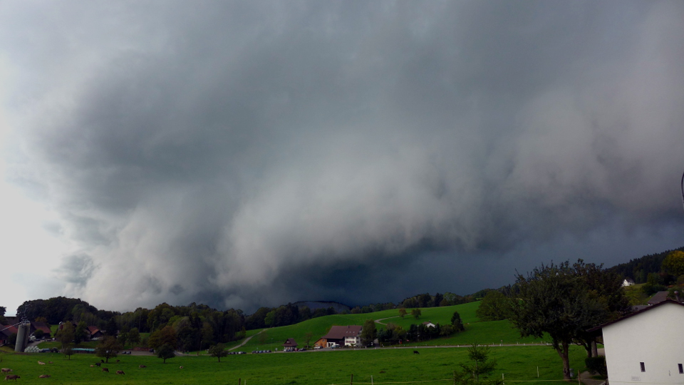 Eindrücklicher Aufzug auf dem Albispass um 1330 mit turbulentem Einströmbereich, vielen CC-Blitzen und heftigstem Platzregen (ohne Hagel).