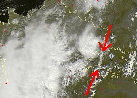Könnte es sein, dass dieses, mit roten Pfeilen markierte Wolkenband im Sat-Bild die Gust-Front des (Ex-)Mesosystems über Ostfrankreich anzeigt? Dieses Band wandert gemäss dem Sat-Loop (sat24.com) brav ostwärts. Die Temperaturen und auch die Windstärken deuten darauf hin. Westlich und östlich dieses Bandes ist es klar, aber die Temperaturen im Tiefland sind nur östlich des Bandes über 30 Grad. Auch die Winddaten zeigen westlich des Bandes stärkeren Wind als weiter im Osten. Aktuell kräftiger Joran im drei-Seen Land.