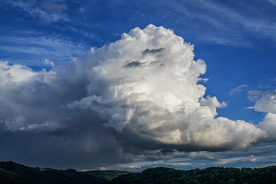 Seit Mittag gab es Schauer im 3-Stunden Takt, aber nur der letzte, kurz nach 21 Uhr, war mit 8 mm recht ausgiebig. Blitz und Donner gab es mind. bei den beiden letzten Staffeln. Anbei ein schöner Cumulus, Abschluss der Staffel von 18 Uhr, und, zur Dokumentation, eine mehr als mickrige Blitzaufnahme von der letzten Staffel, die auch sonst ein paarmal ein müdes Wetterleuchten generierte.