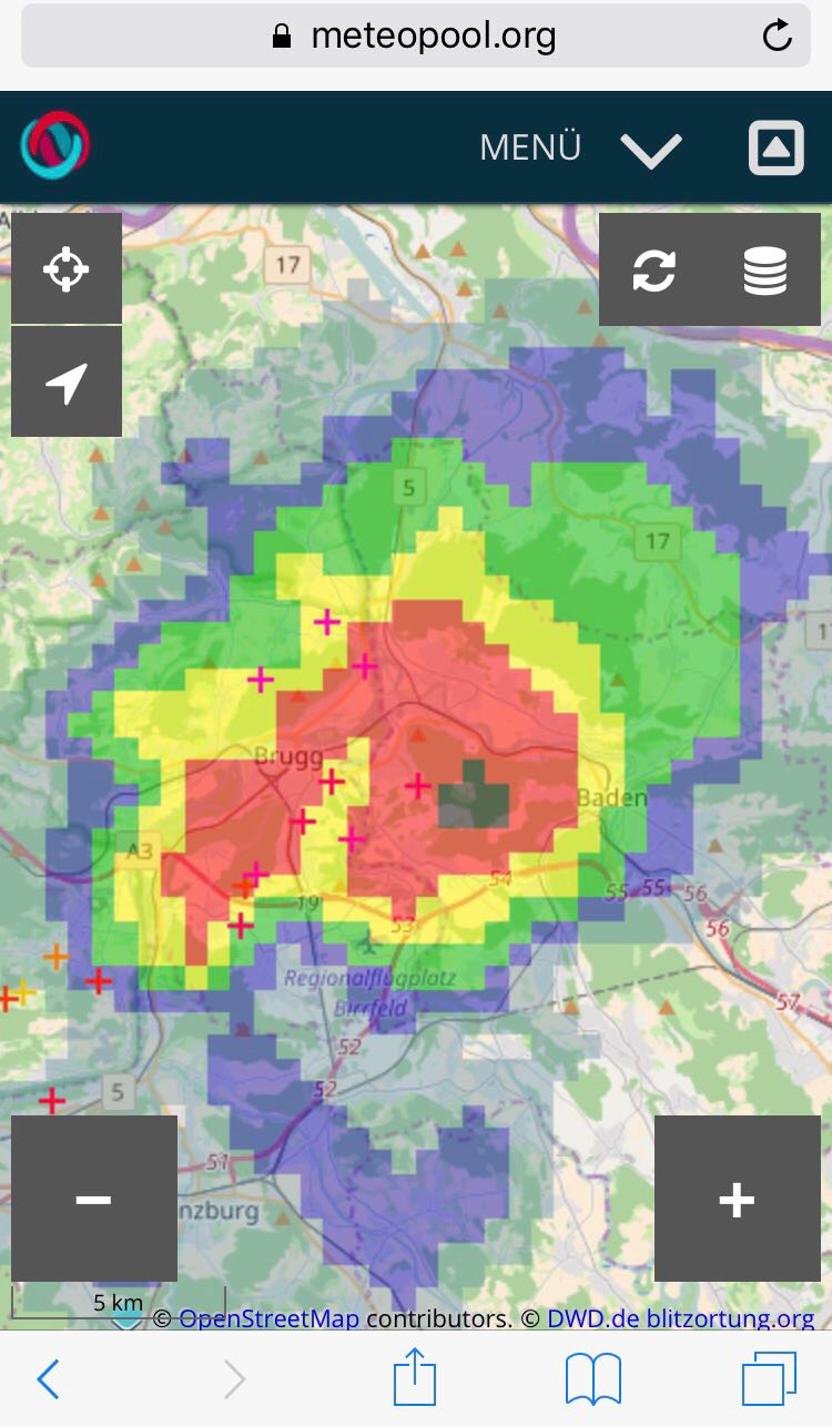 Leider kamen wir dabei etwas zu spät, da es auf der Autobahn Richtung Zürich noch ein Unfall gegeben hat. Diese Zelle hatte ein verdächtiges Hook-Echo (gemäss meinem Augenmass), könnte aber auch ein Radarfehler gewesen sein?
