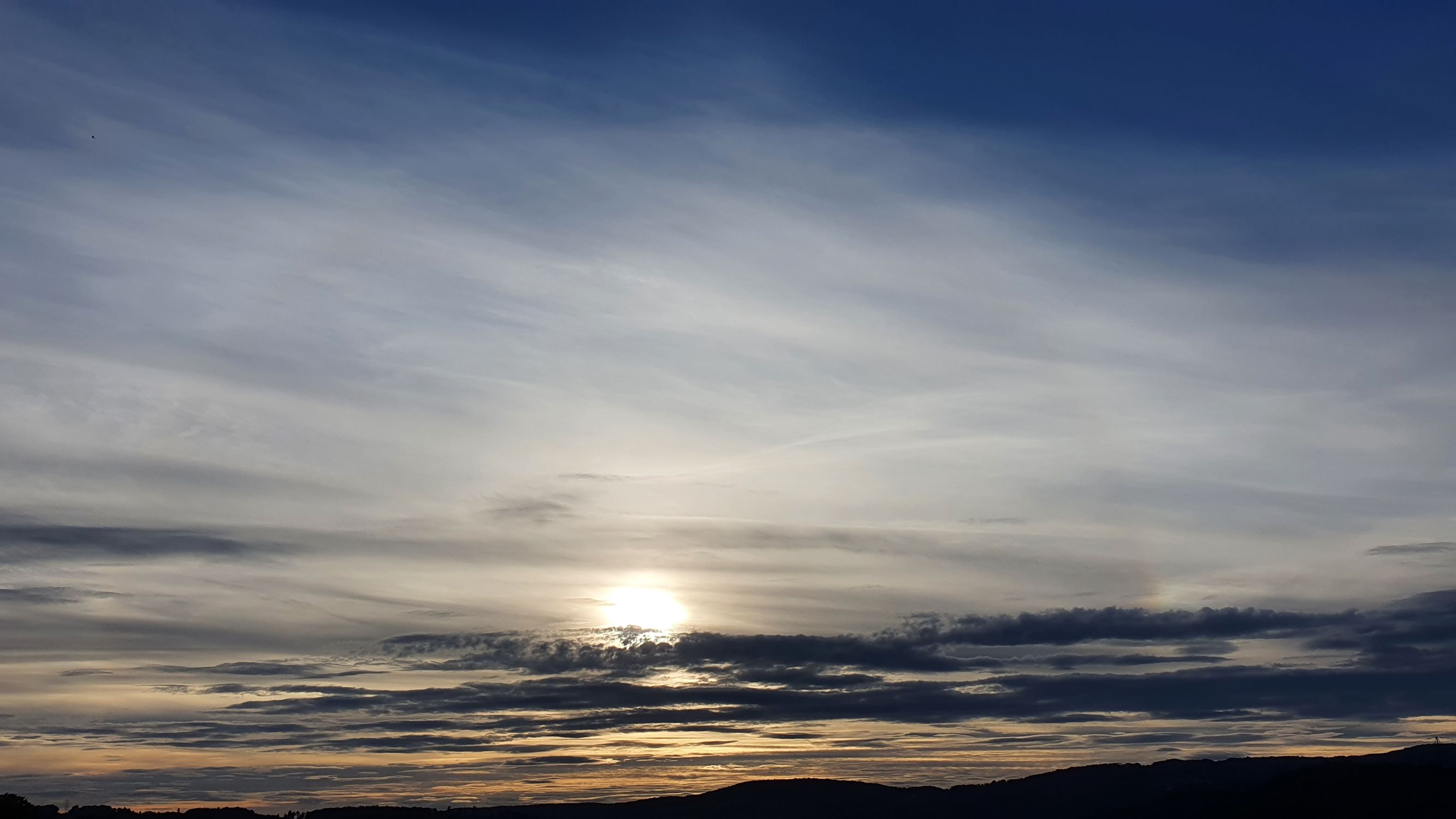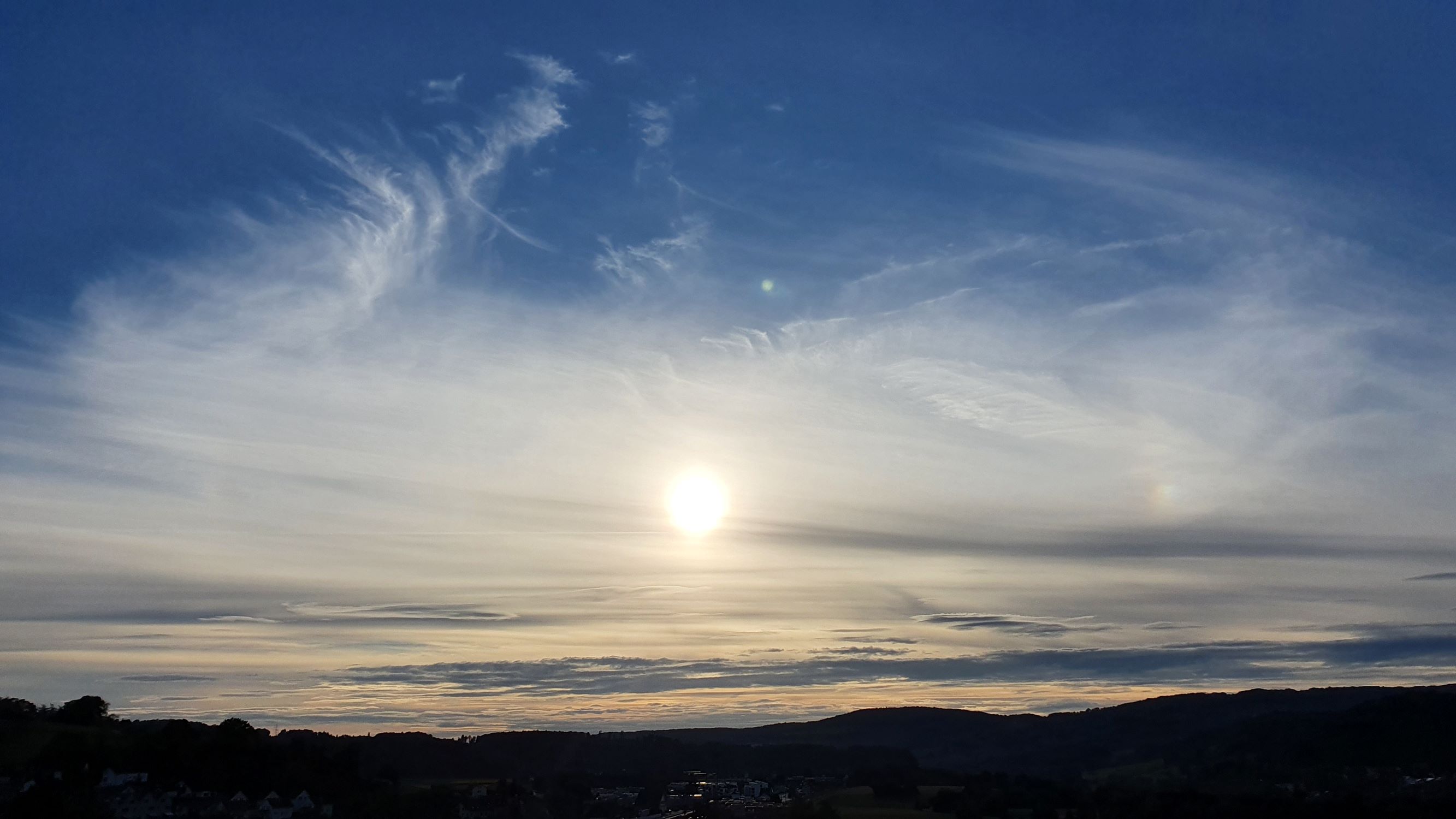 Fantastischer Sonnenuntergang am 4. Juli mit einem Farbspektakel der Superlative. Viele Schleierwolken sorgten für ein Halo mit Nebensonnen und die anrückenden Wolkenbänder glänzten im Abendlicht mit farbigen Lenticularis. Für mich einer der schönsten Sonnenuntergänge seit langer Zeit.