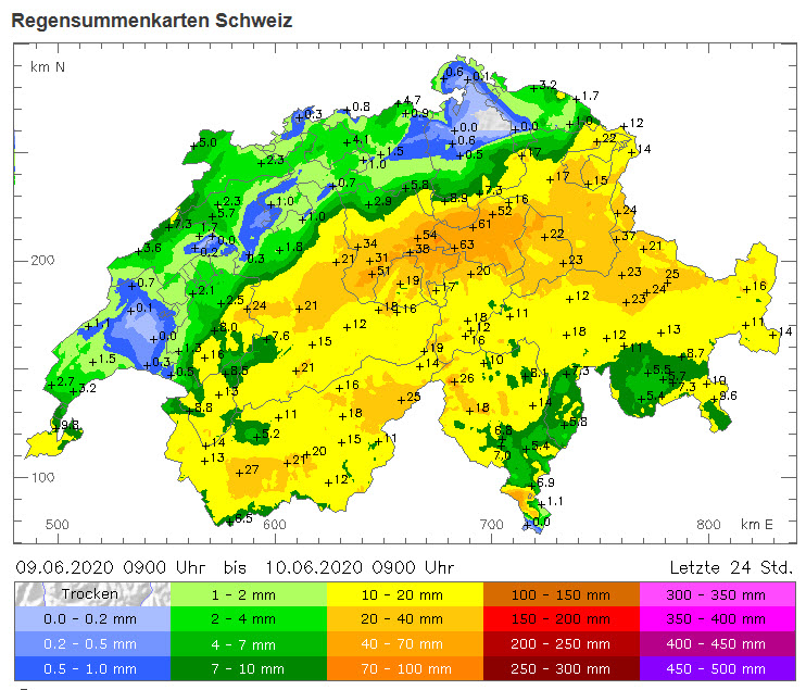 Schon interessant - trotz nasser/feuchter erster Junihälfte hat es in einigen Regionen (z.B. hier in der NW-Schweiz) mengenmässig noch nicht einmal die Hälfte der Norm-Monatsmenge geregnet. So wie es aussieht momentan, wird das Soll bis Ende Monat auch nicht wirklich erreicht und wir werden hier einen weiteren zu trockenen Monat erleben.
