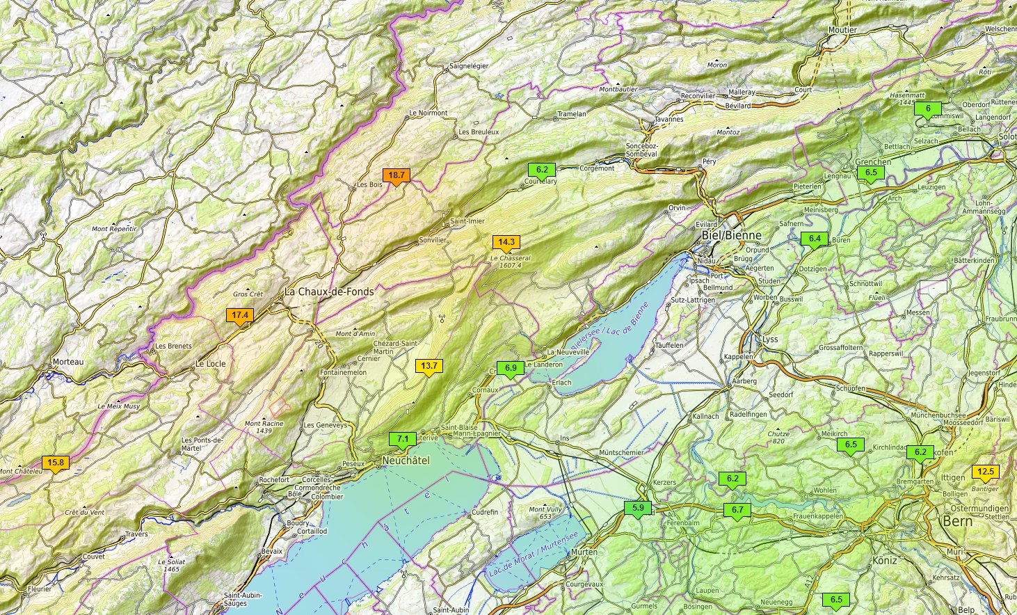 La Chaux-d’Abel 999m: 19°, Courtelary 708m: 6° Differenz 13°