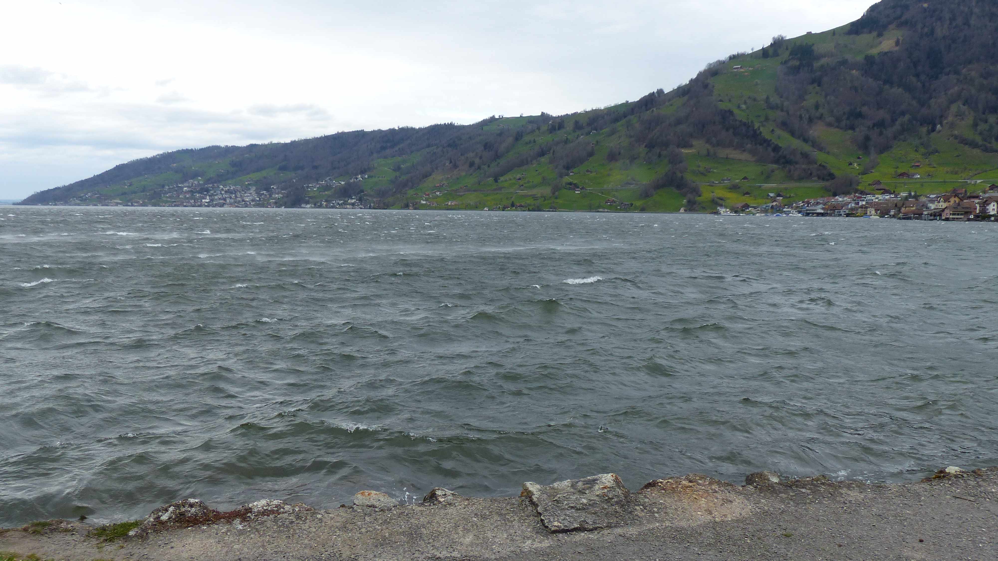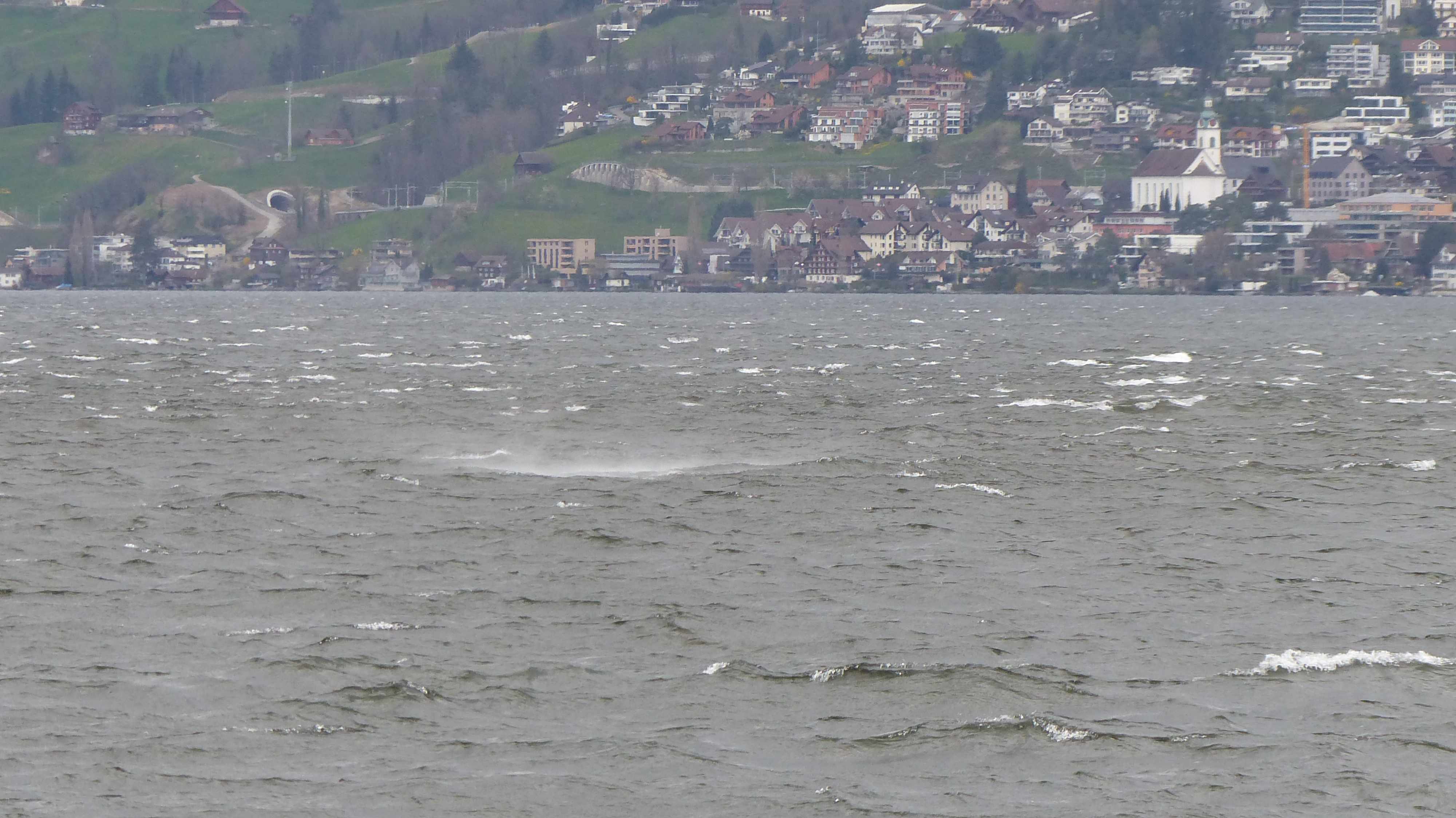 Auf dem Zugersee bei Arth haben es die Böen knapp geschafft, Gischt über den See zu blasen.