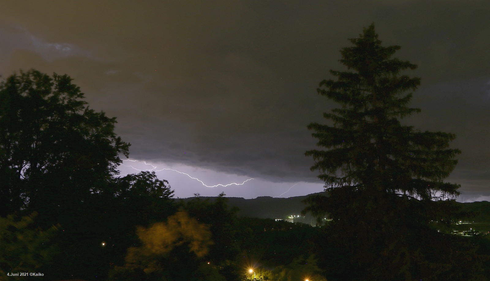Nachdem das anfängliche und intensive Wetterleuchten immer näher kam, wurde ich dann doch langsam nervös und versuchte mein Glück auf der Terrasse. Fast nur CC-Geblitze mit viel Regen und Wind und daher verschiffte Linse und wenig Struktur am Himmel. Der Schlusschlapf ging dann erfreulicherweise doch noch in den Boden.
