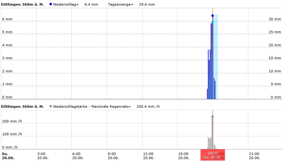 Stundensumme von über 30mm ist es geworden bei einer neuen Rekordregenrate von 250mm/h