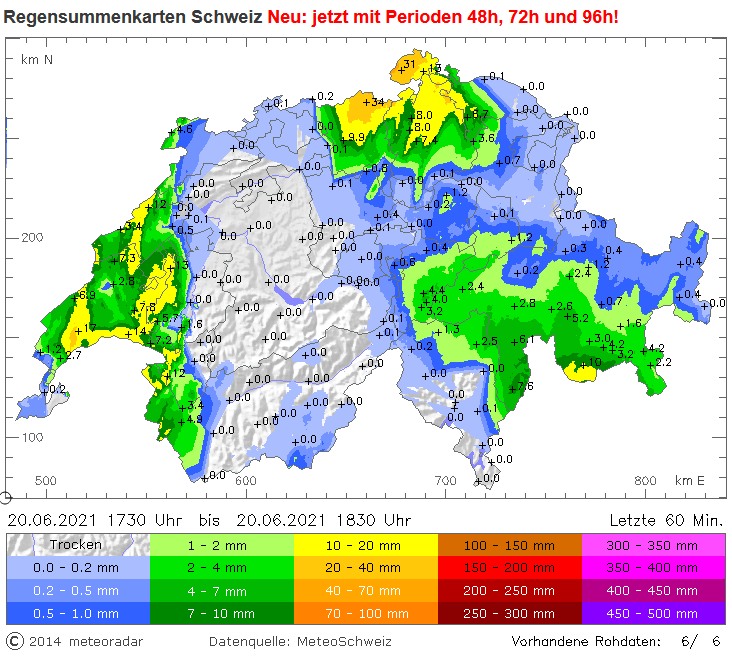 Die vorhin erwähnte 2. Welle scheint nach 20 Uhr ab Bern bis ca. 22 Uhr in den Schwarzwald um einen Punkt herum zu rotieren. So siehts momentan auf dem Niederschlagsradar von MeteoSchweiz und auf search.ch aus.