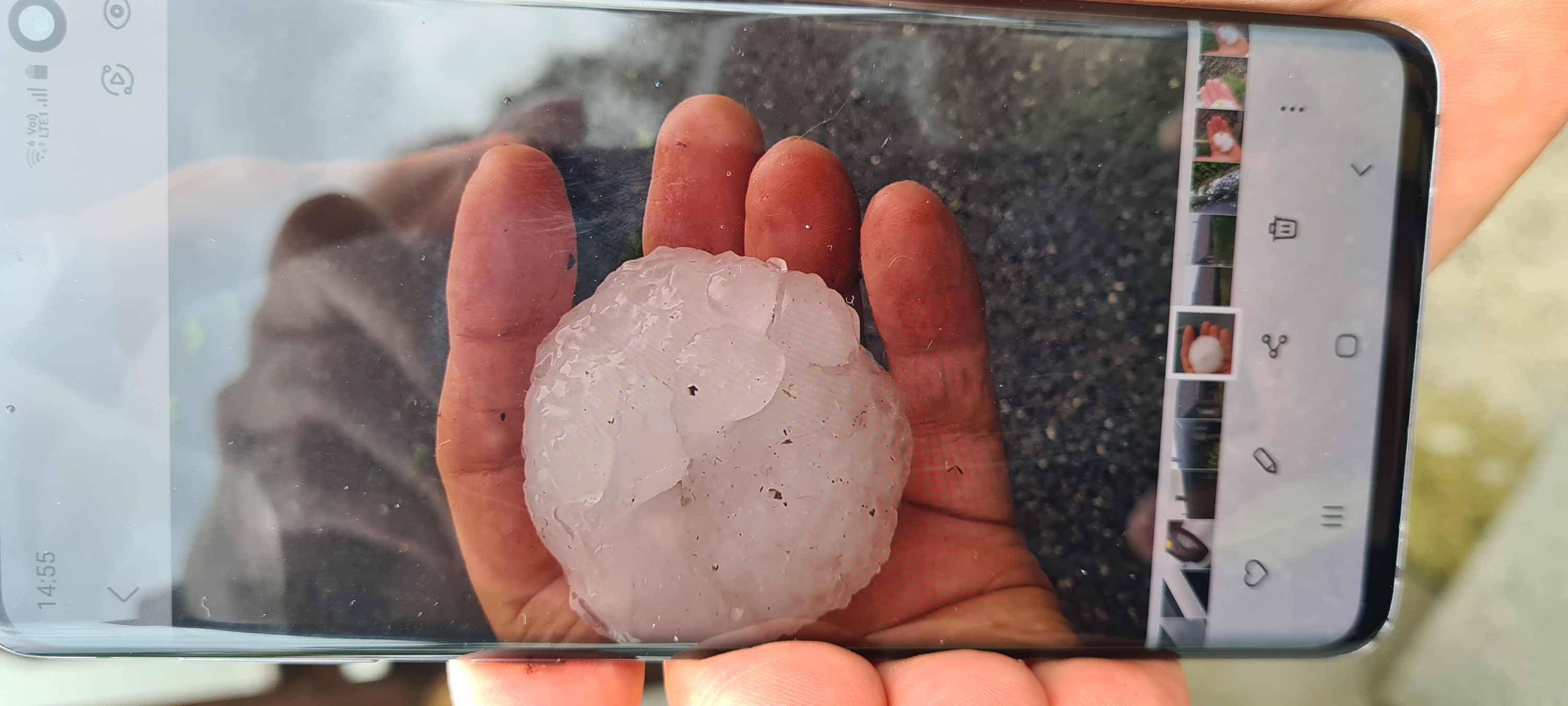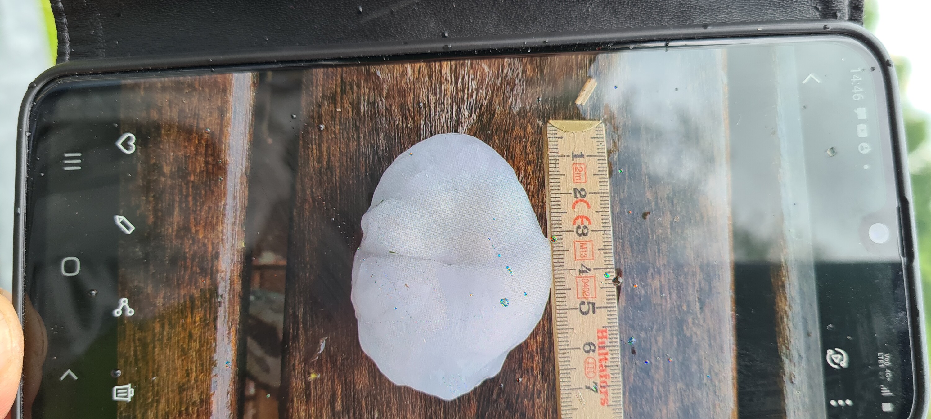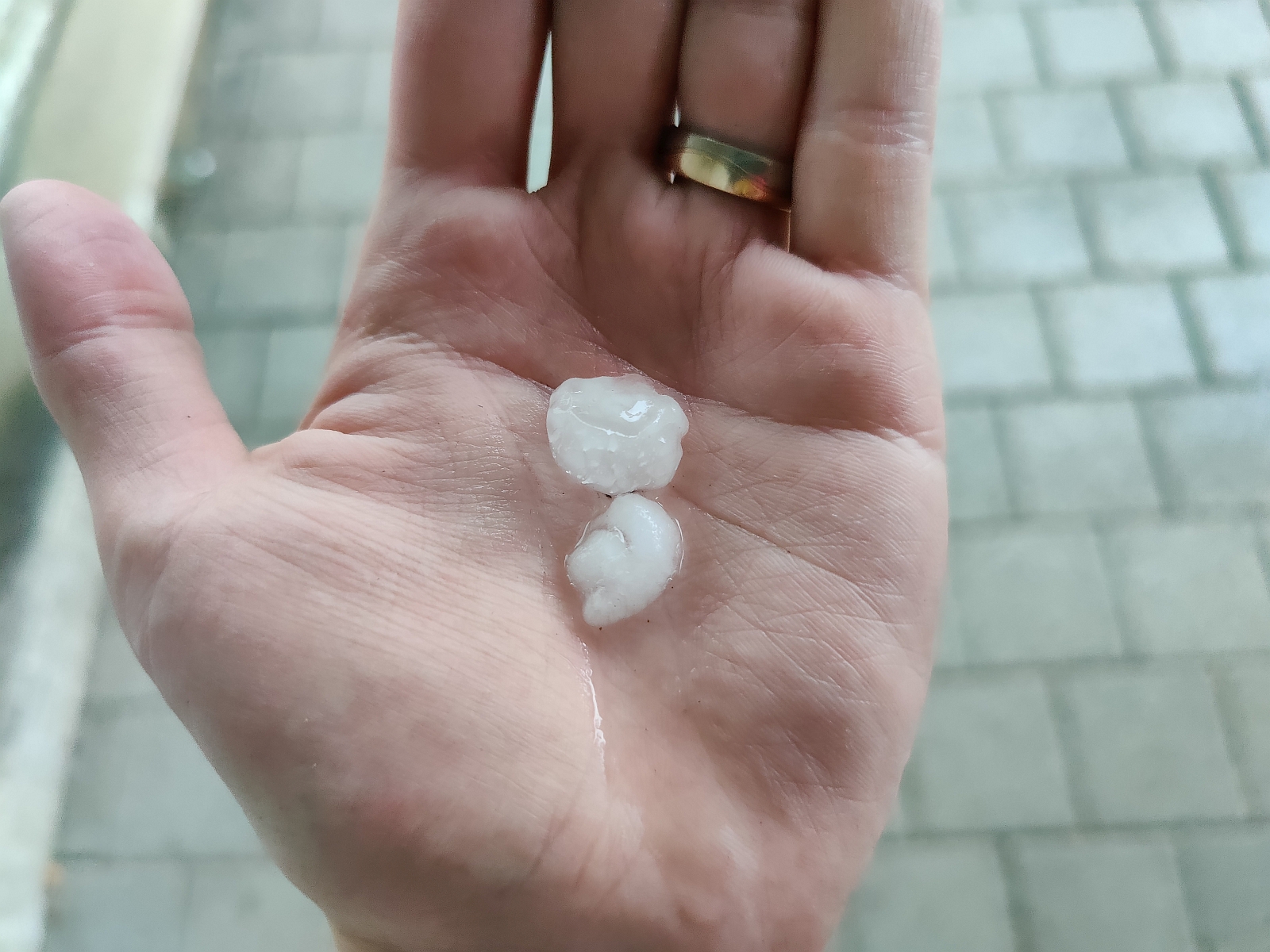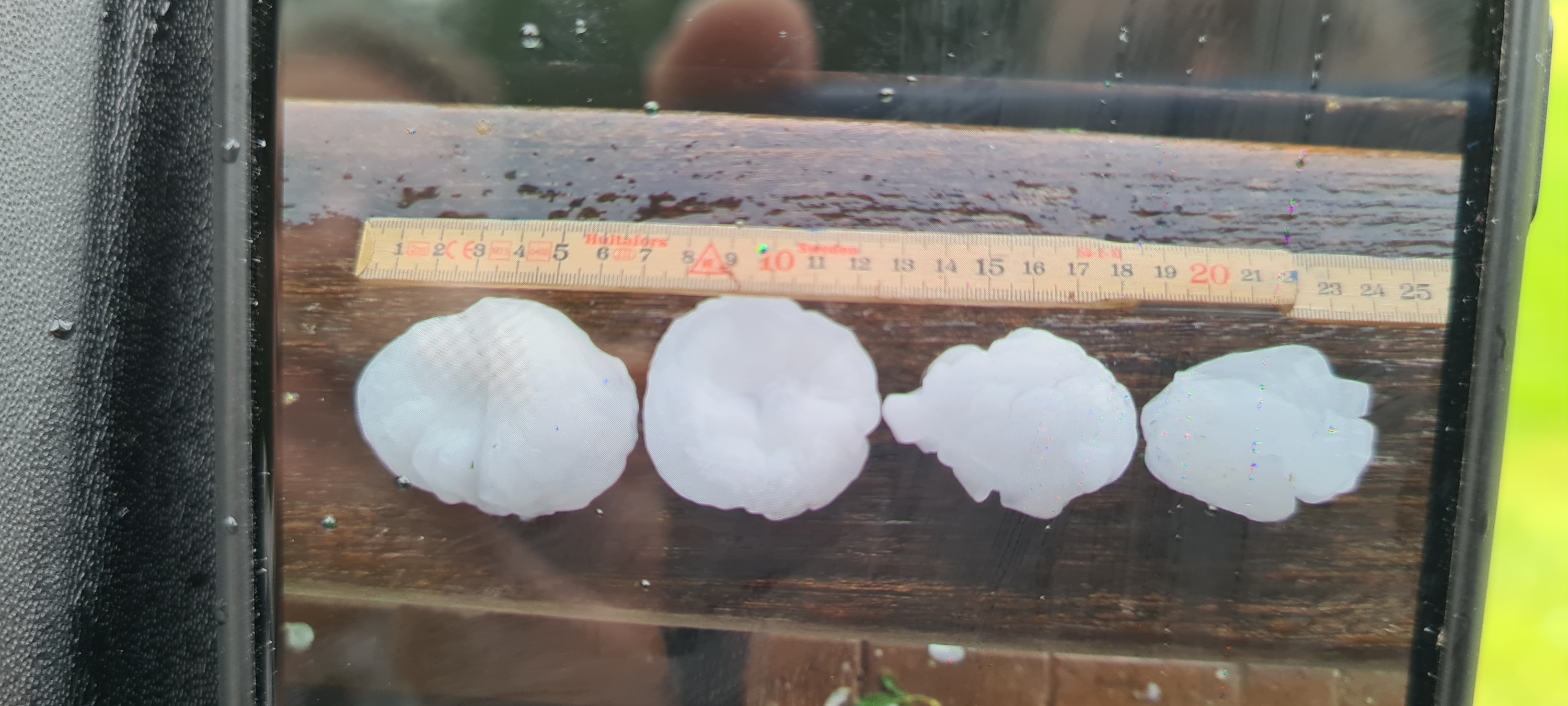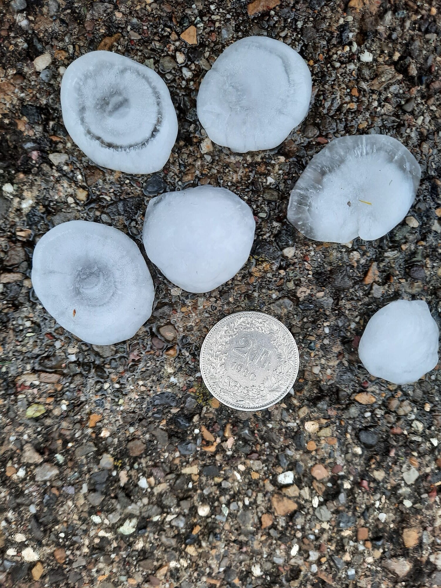 Die Hagelsteine auf dem zweiten Foto sind zwischen 2,4 und 4,0 cm gross. Berücksichtigt man den Schmelzvorgang in einer Stunde und den vorangegangenen Waschgang beim Regen durch die Nachzüglerzelle, scheint es nicht vermessen die max. Grösse bei 4 bis 5 cm anzusetzen.