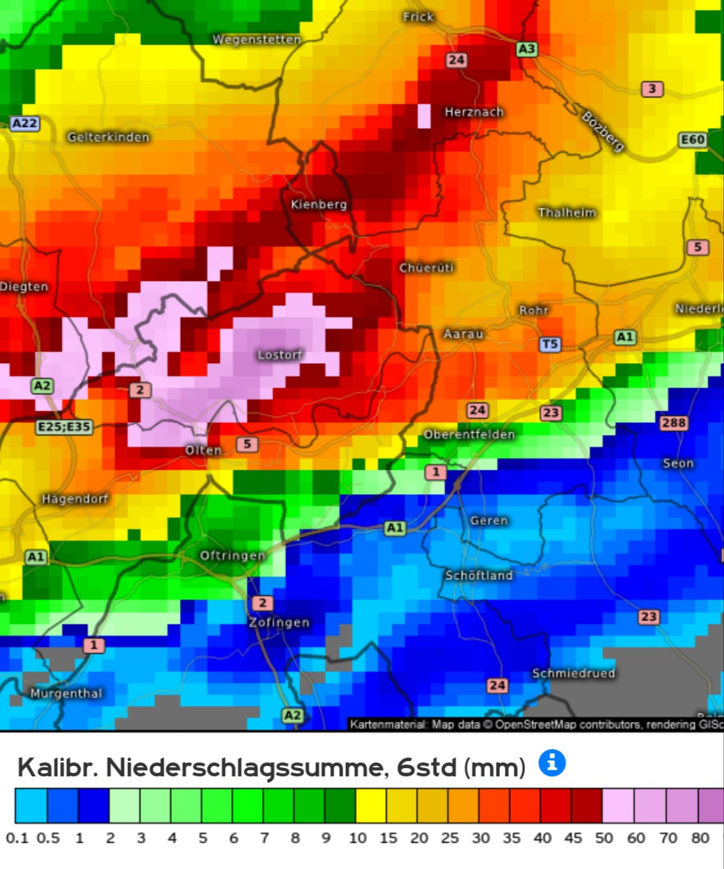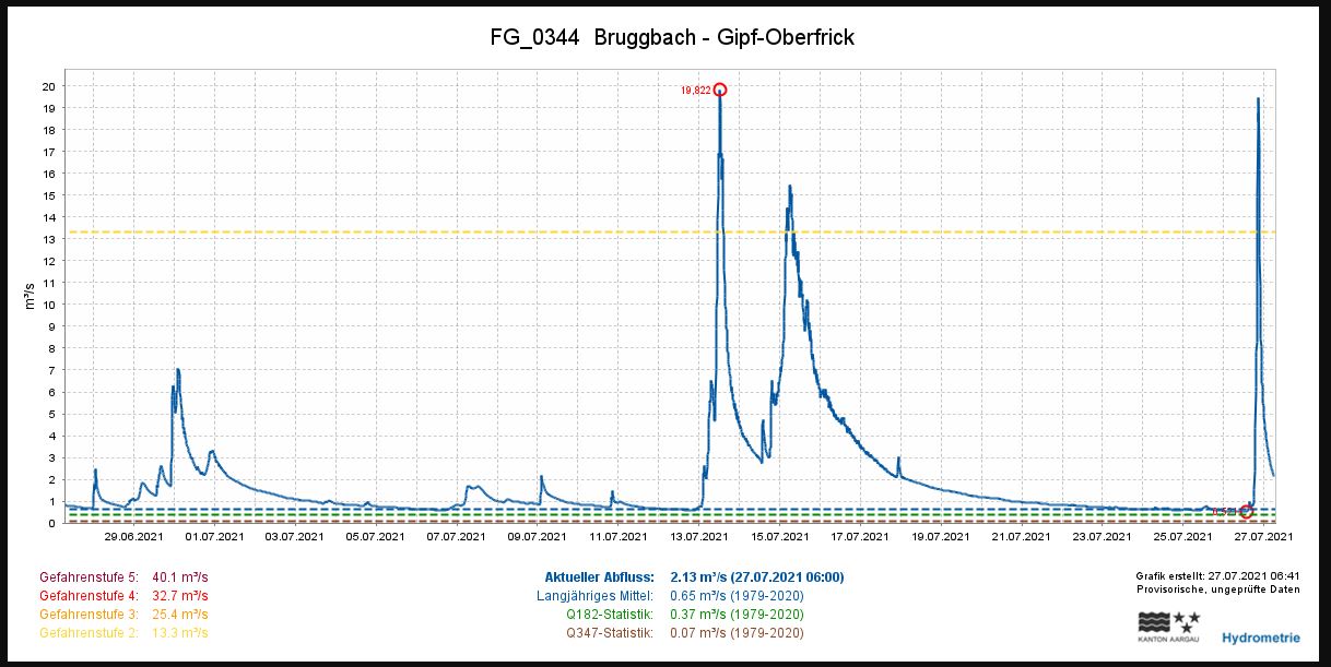 Ab 17 Uhr bis 21 Uhr gab es knapp 30mm alleine In Gipf–Oberfrick, min. 4 Gewitter zogen vorbei.Im Einzugsgebiet siehe Jan (Zeiningen) gab es sicher einiges mehr.