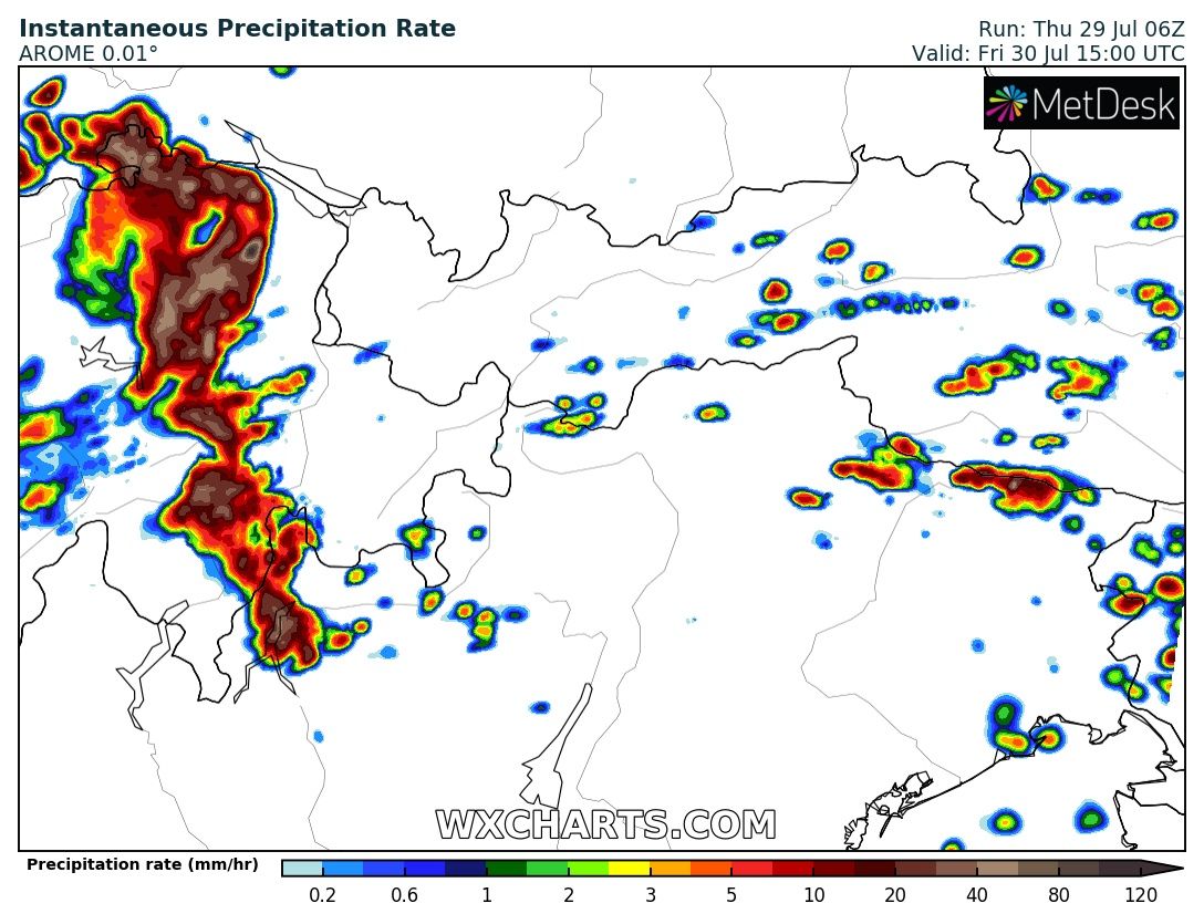 Trotz der hohen Feuchtigkeit - welche ja das Risiko für Sturmböen theoretisch etwas abschwächen kann - hat AROME im neuesten Lauf wie COSMO eine Gewitterlinie (Squall.Line?) drinnen -> Windböen teils über 100km/h, wobei AROME nach meiner Einschätzung bei Windböen immer etwas übertreibt.