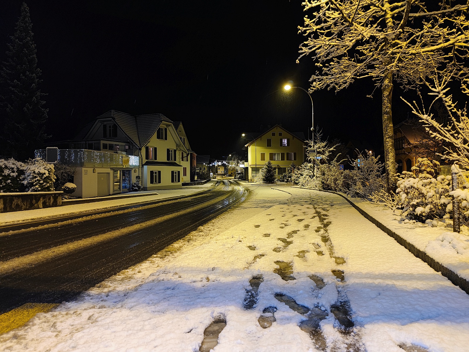 Aktuell liegen nach 2h 5-6cm Schnee in Thun, nach eindunkeln blieb nun auf Gehwegen und Strassen was liegen.
