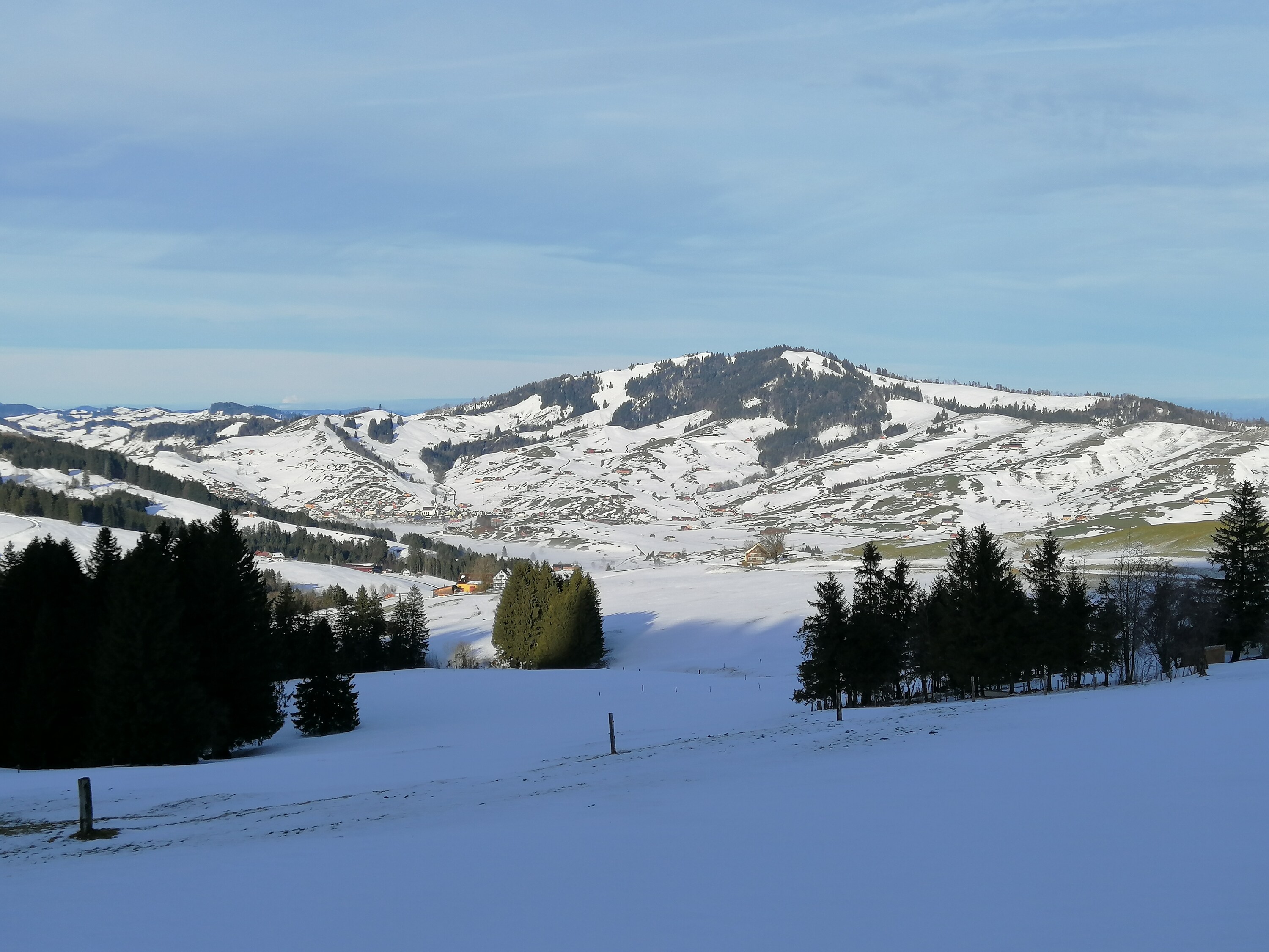 Auf 1100m ist der Schnee gefroren, je nach Windexposition liegen 30-50 cm Schnee. Blick Richtung Gonten und Hundwiler Höhe