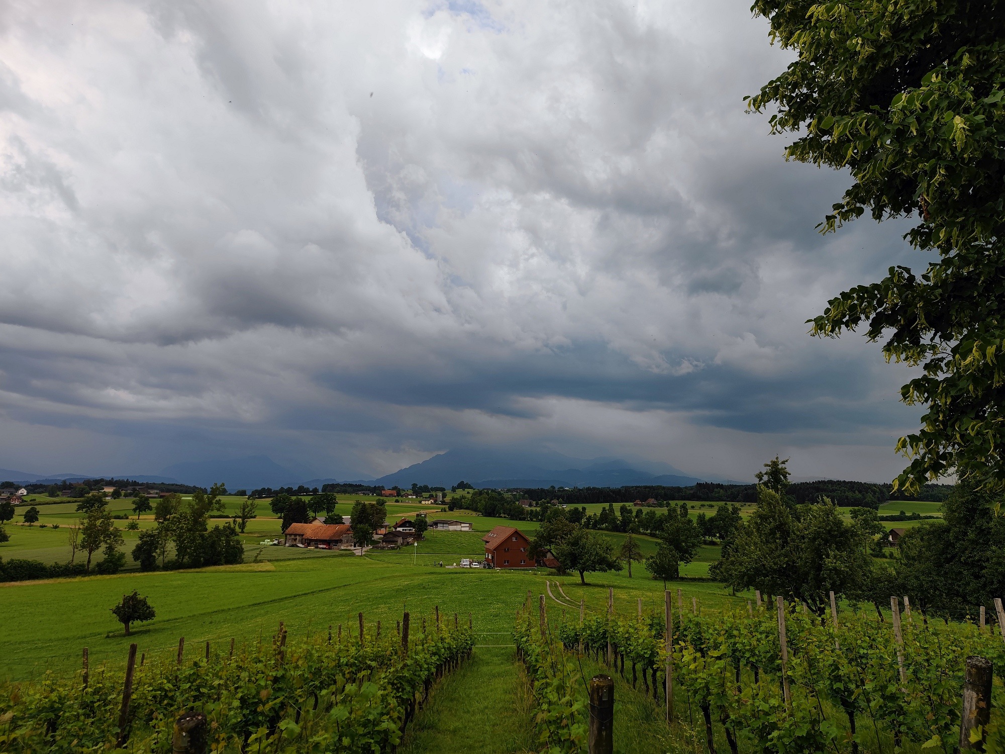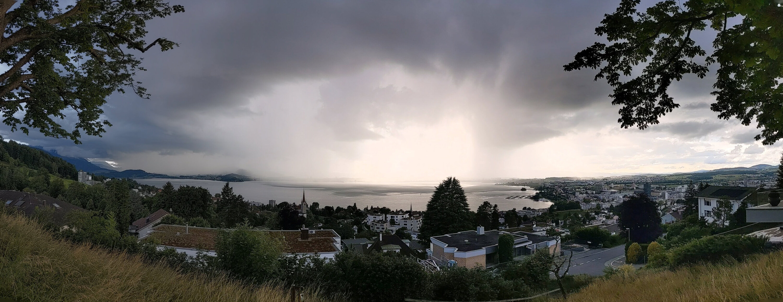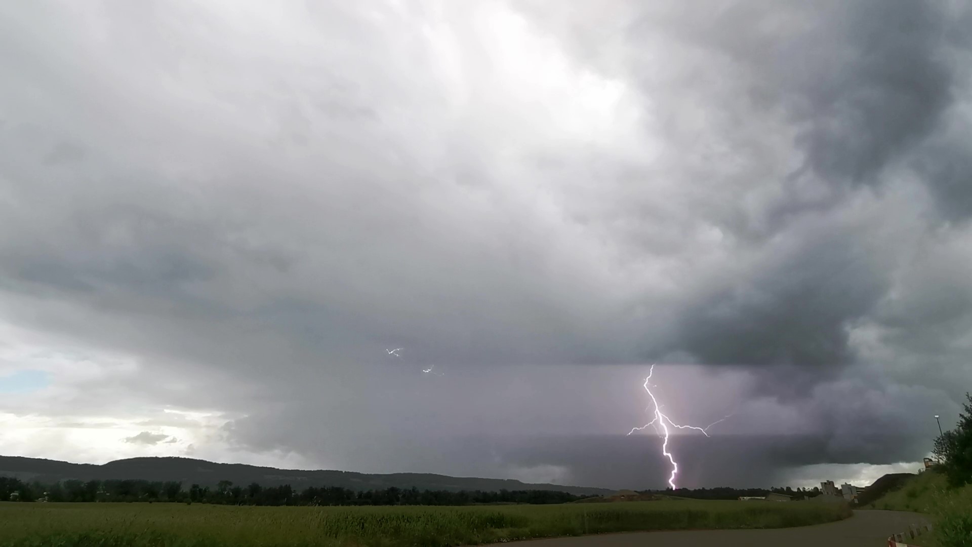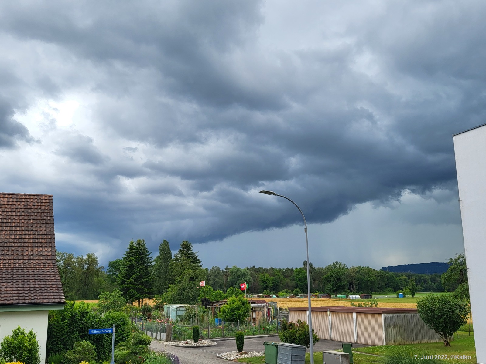 Kurz danach Kameraschwenker von SE nach SW. Es nähert sich ein neues Gewitter direkt auf mich zu. Rechts im Bild der kommende Niederschlag, rauschte wie ein Sturzbach, und die Lautstärke nahm kontinuierlich zu (Audio dazu folgt später). Dann kurze Babywasserbombe mit Körnchen bis 1 cm Durchmesser. Da es kaum Wind gab, verirrten sich nur sehr wenige Körner auf meine Terrasse. Bei Meteosvizzera in der Nähe gab es 5 mm Niederschlag.