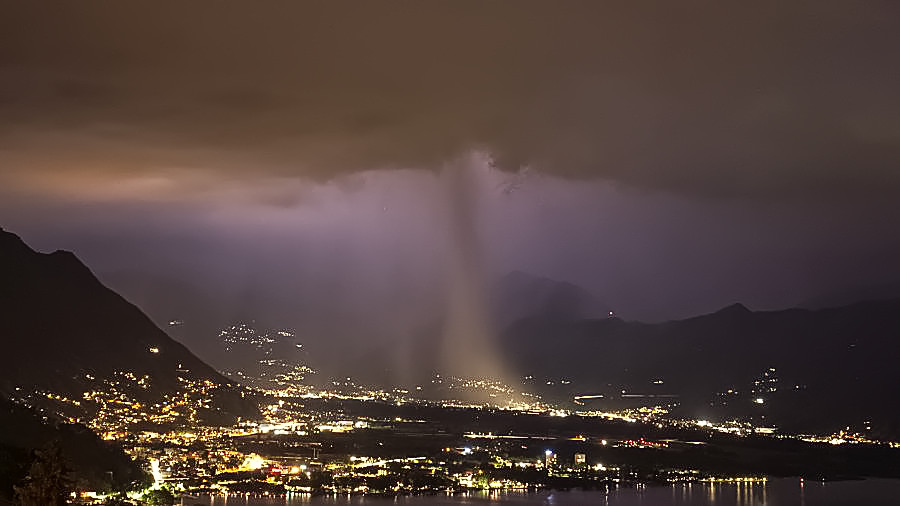 Kein Tornado, sondern eine schmale Niederschlagskaskade über der Magadinoebene, evtl. begleitet von einem Downburst oder Microburst. Darauf deutet die trichterförmige Ausweitung kurz über Boden.