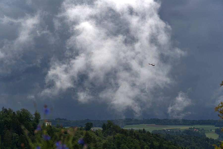Aber um 6 war Schluss mit der Ruhe, ich kam mir vor wie im Militär. Das Morgengewitter brachte nicht sehr viel zustande, immerhin ein Miniaturblitz mehr in der Kamera. Noch unergiebiger war eine Neubildung im Osten Richtung Magadino-Ebene, etwa um 10 Uhr.