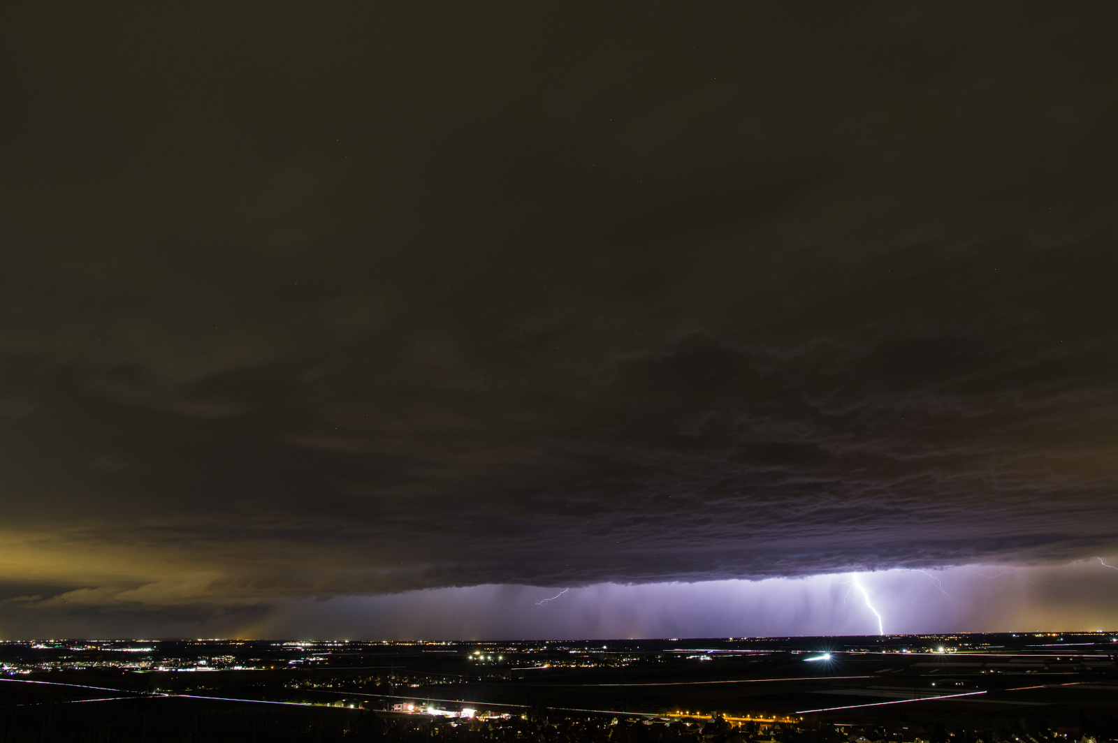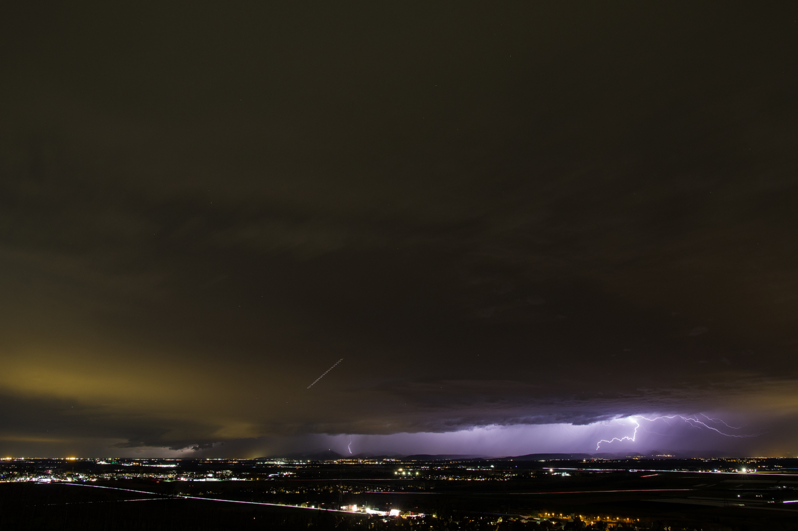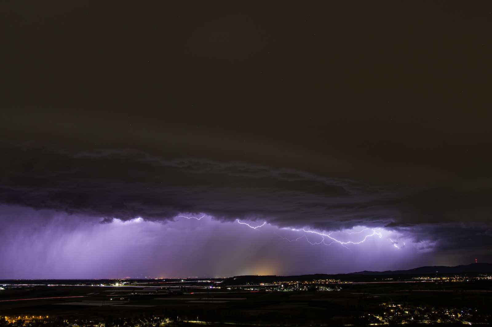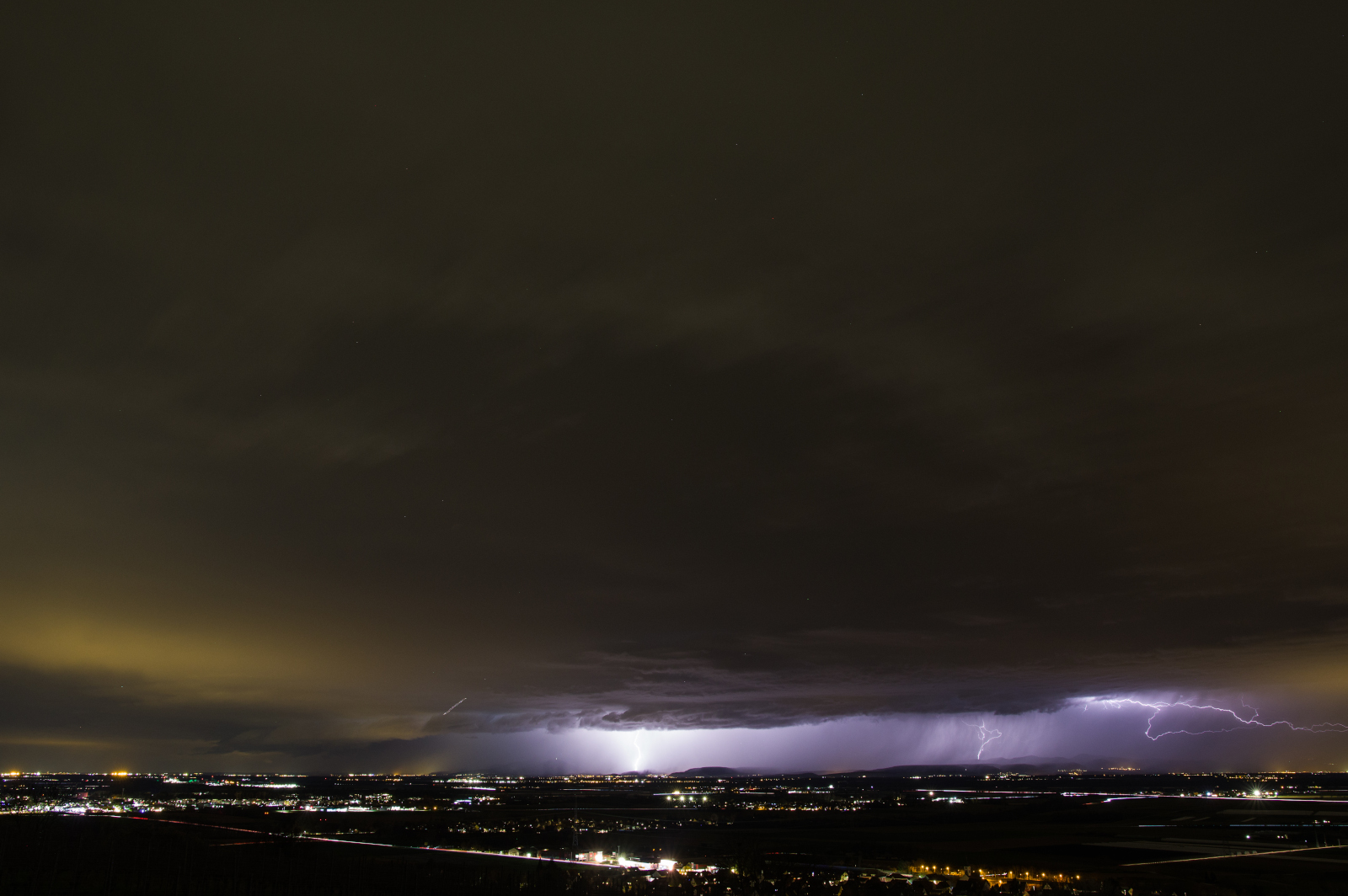 hatte heute Glück und konnte die Gewitter im Oberrheingraben beobachten. Eine Zelle zog noch bei Tageslicht zwischen 18 und 19 Uhr aus Frankreich kommend durch den Rheingraben, die sich erst jetzt gegen 22.15 Uhr an der Grenze zu Tschechien über Bayern aufgelöst hat. Zu ihr poste ich die Tage noch zwei-drei Bilder, war im Rheingraben nicht so spektakulär...