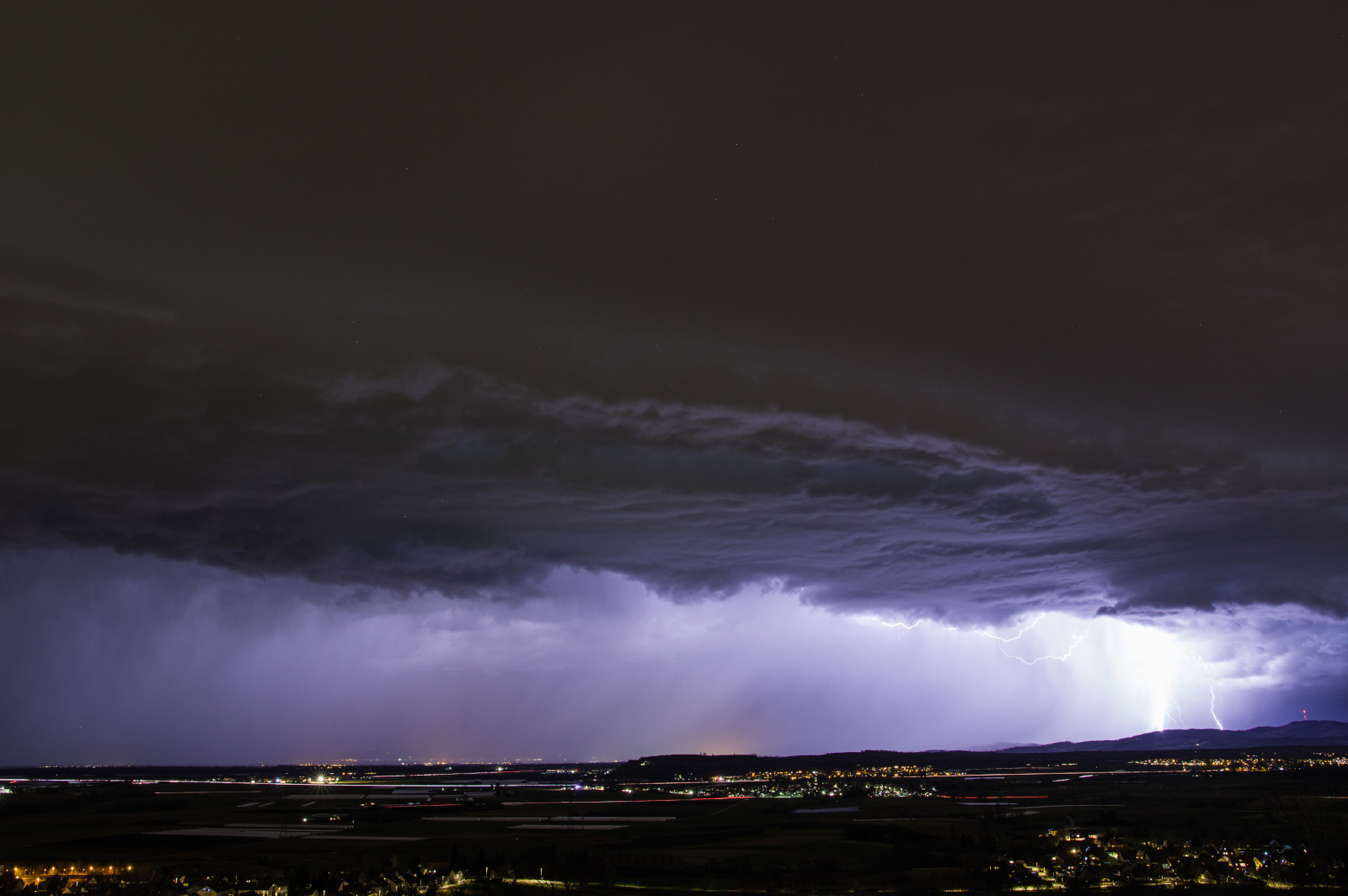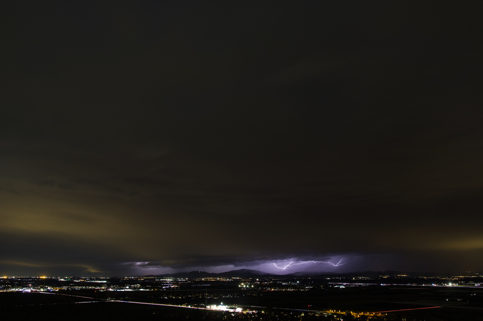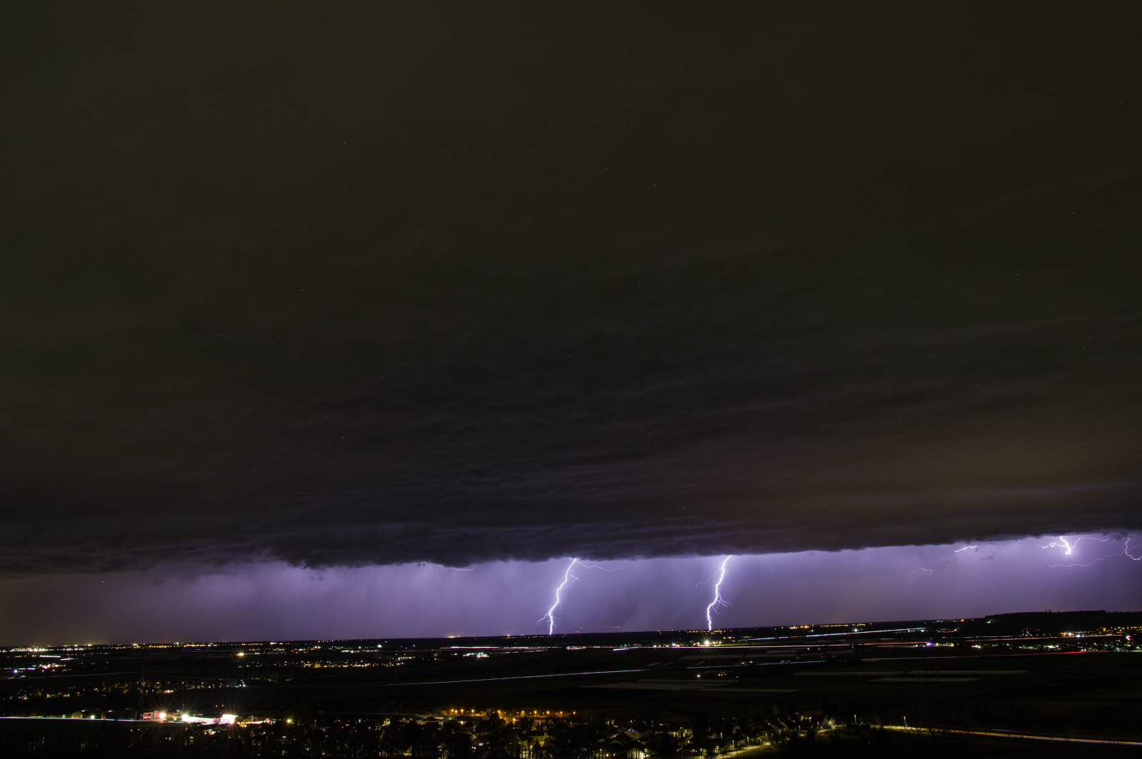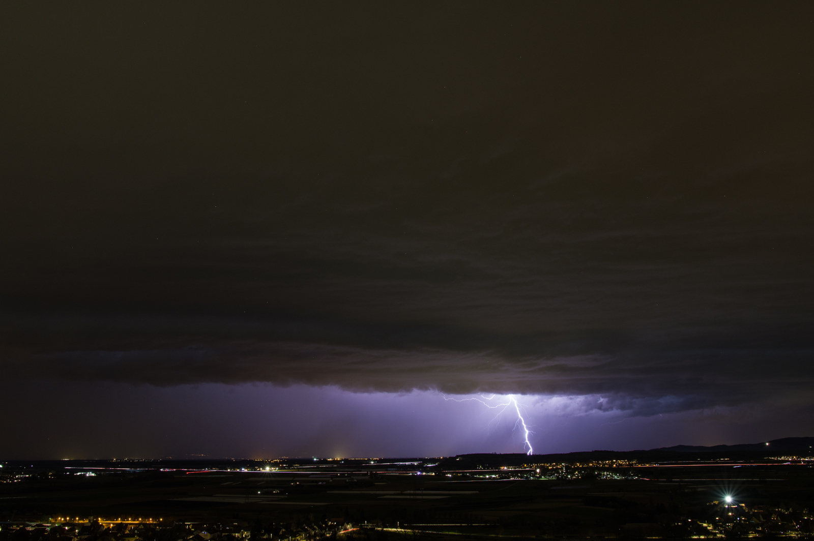 hatte heute Glück und konnte die Gewitter im Oberrheingraben beobachten. Eine Zelle zog noch bei Tageslicht zwischen 18 und 19 Uhr aus Frankreich kommend durch den Rheingraben, die sich erst jetzt gegen 22.15 Uhr an der Grenze zu Tschechien über Bayern aufgelöst hat. Zu ihr poste ich die Tage noch zwei-drei Bilder, war im Rheingraben nicht so spektakulär...