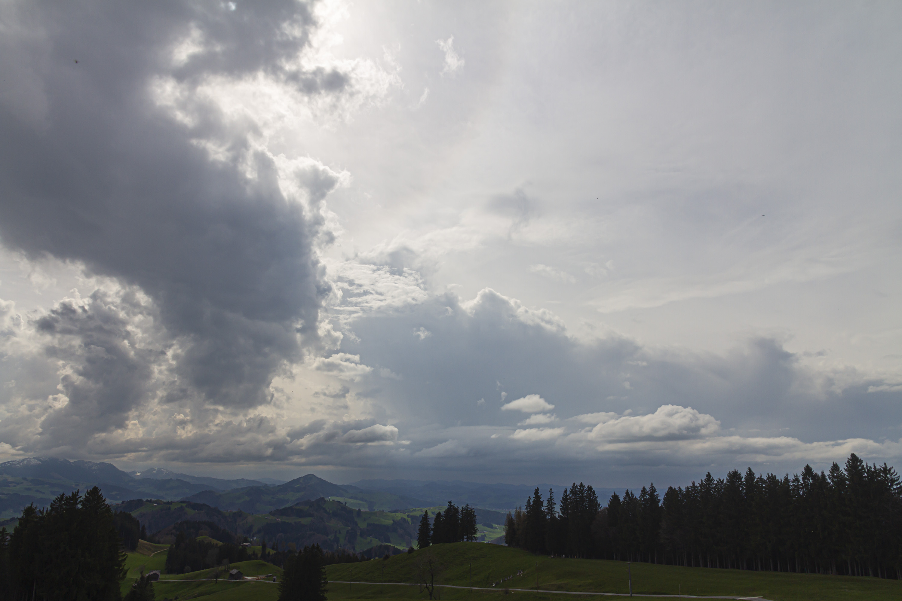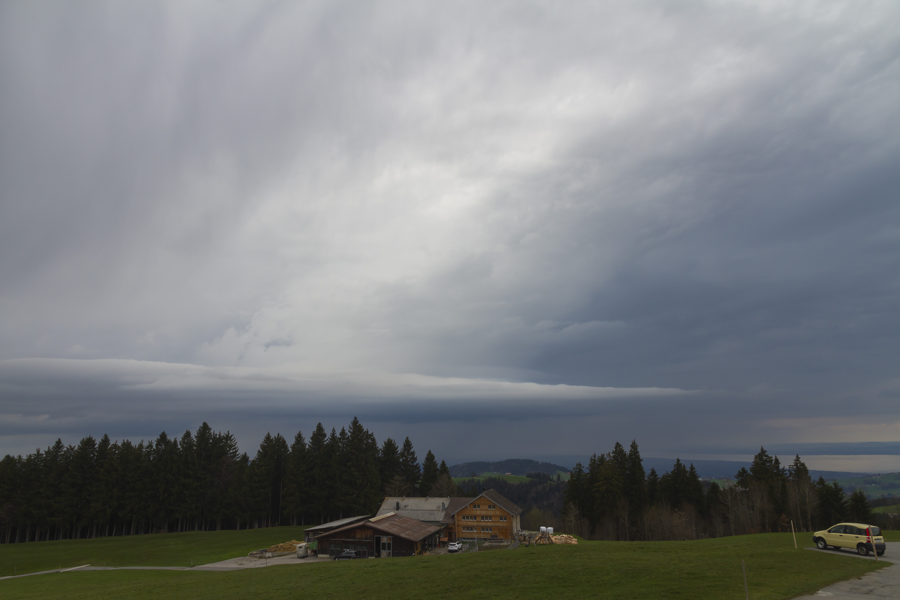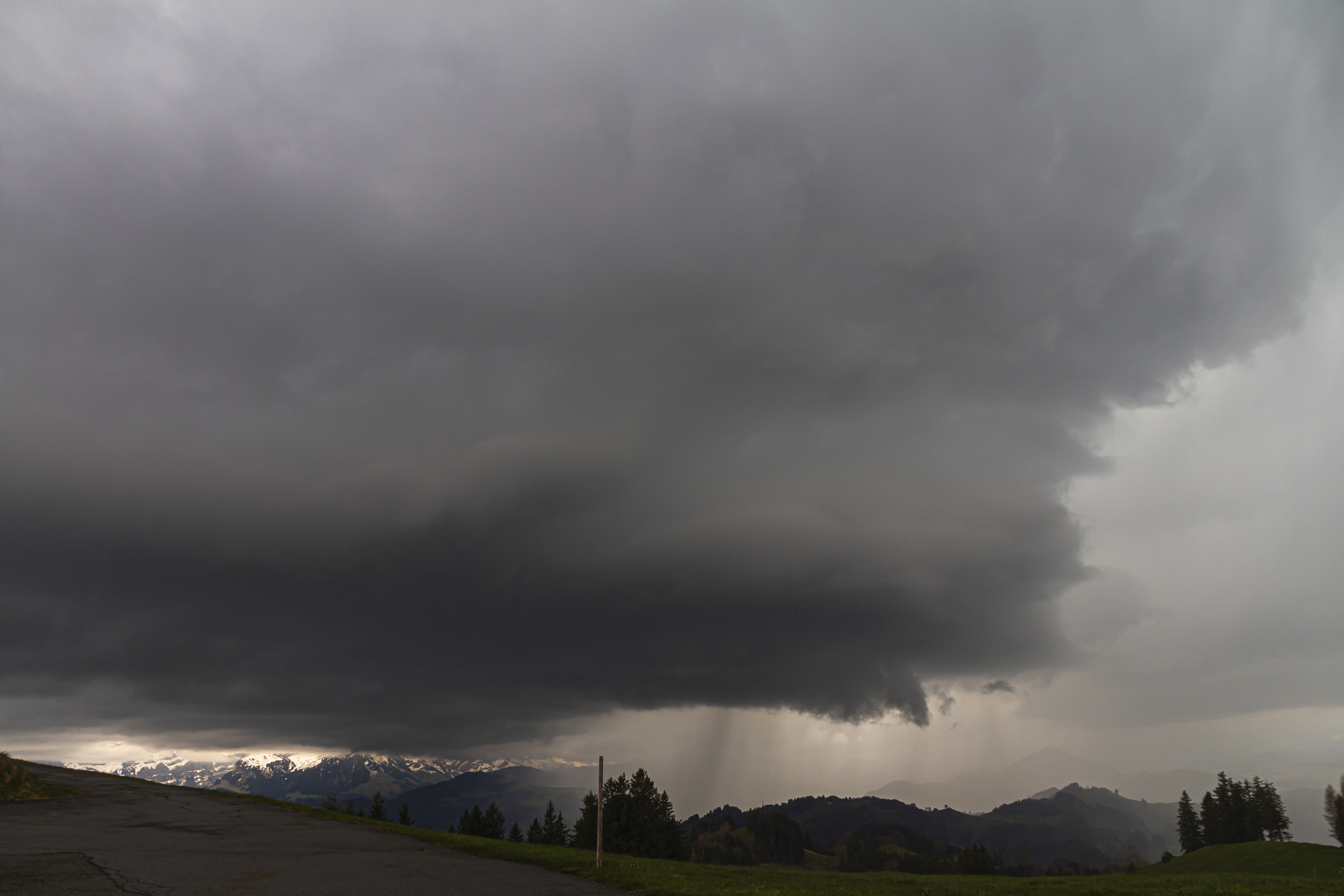 Ein kräftiges Gewitter für April hat den Schwäbrig aus Südwesten voll getroffen. Es gab Dauergrummeln und soliden glasklaren Hagel mit Durchmesser von 1cm. Ich war schon früh auf dem Gäbris oben, da die Modelle eindeutige Aktivität zeigten. Auch Wind und Wetter generell passten gut mit Konvergenz dank leichter Föhntendenz über dem Bündnerland. Die Strukturen kurz vor dem Eintreffen des Gewitters waren ziemlich krass für April, da war etwas Scherung im Spiel.