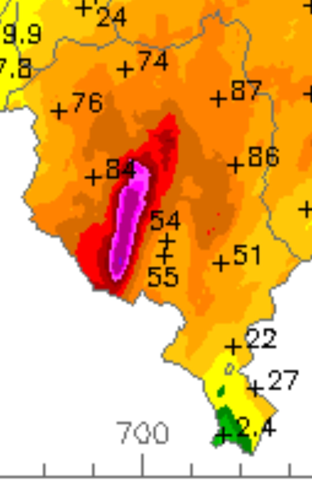 Zur Dokumentation: Auf der Meteoradar Regensummenkarte erscheint nun erstmals ein ganz kleiner Fleck der höchsten Stufe (450-500 mm). Das sehe ich auf dieser Karte das erste mal für den Zeitraum von 24 h.