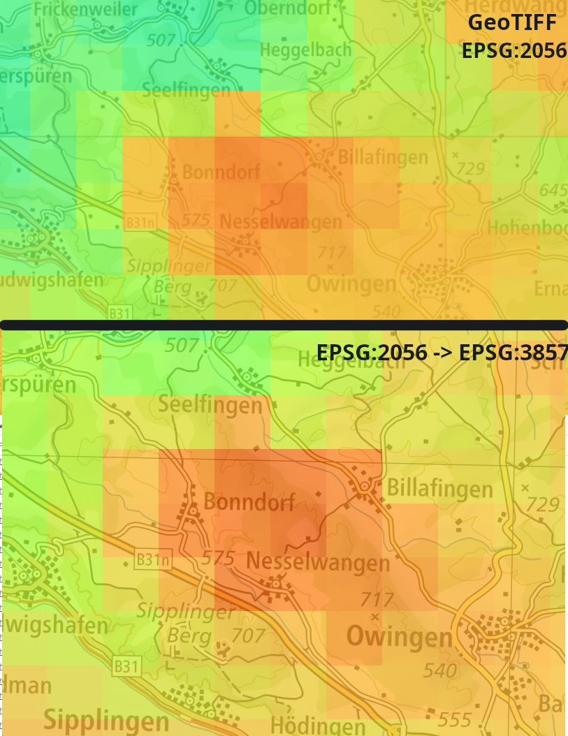 Ich habe mit einer GeoTIFF implementation angefangen um einen Eindruck zu bekommen, was bei der Koordinatentransformation verloren geht, bzw. verschoben wird. Die Abweichungen halten sich glaube ich im Rahmen. Aber auf die Präzision möchte ich auch nicht verzichten wenn es anders geht.
