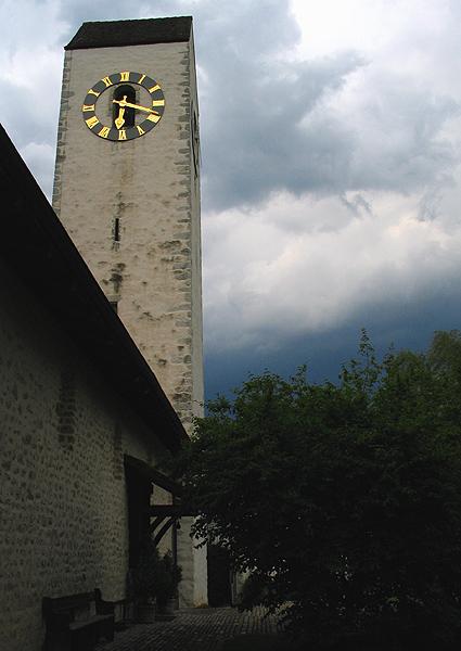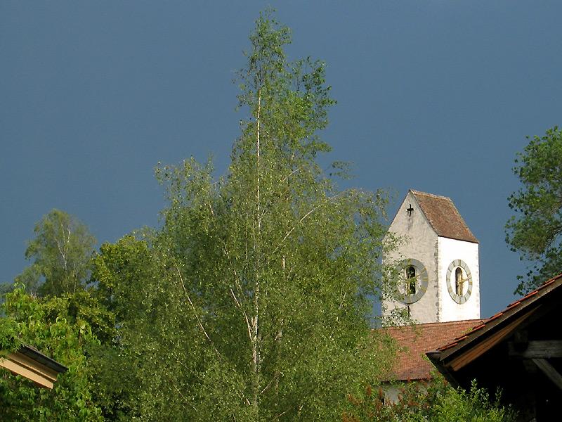 Ich erreichte aber Amsoldingen gerade rechtzeitig, um den in der Sonne leuchtende Kirchturm vor dem schwarzen Himmel noch ablichten zu können: