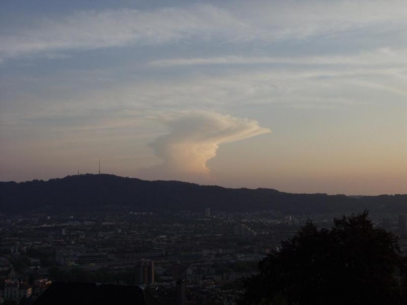Hier in Boll, östlich von Bern hats vorhin für kurze Zeit heftig geregnet. Die Zelle ist nicht sehr hoch, die Sonne scheint noch durch, deshalb ist auf dem Radar wohl noch nichts zu sehen.
