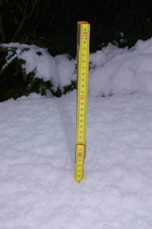 Doch nur Schneehaufen sagen ja nicht allzu viel über die Schneehöhe aus: Heute Morgen um 5:00, als ich mit Schneeschippen begonnen habe, haben 18-20cm (gemessen) auf dem Garageplatz auf mich gewartet. Kaum war ich fertig (was viel länger als sonst gedauert hat, nämlich um 6:20), lagen schon wieder 3cm. Insgesamt lagen um 6:20 also 34-38cm Schnee.