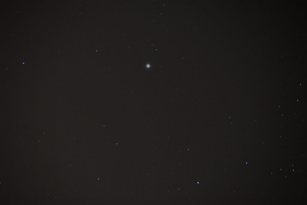 Hier eine Uebersichtsaufnahme der Gegend mit einem Weitwinkelobjektiv. Der Komet ist das flächige Objekt in der Mitte.