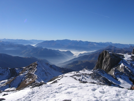 Ausblick auf das Dunstmeer im Churer Rheintal und Vorderprättigau. Interessant zu beobachten waren die zwei Wolkenschichten. Im Rheintal tiefe Obergrenze von ca. 1000 m.ü.M., weiter nördlich Richtung Bodensee eine höhere Schicht auf etwa 2500 m.ü.M. Diese Schicht hüllte den Säntis plötzlich ein.