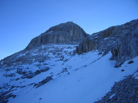 Blick zurück zum Gipfel, der Weg war zum Teil recht schwer, Pulverschnee mit 50 cm Verwehungen