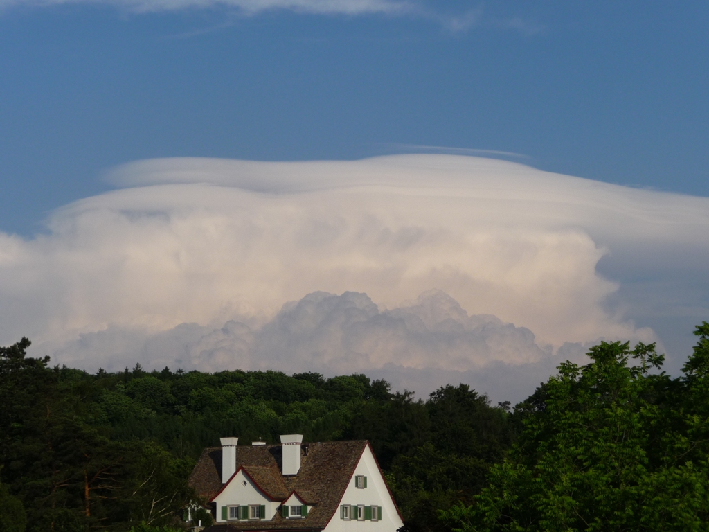 Hier noch ein Foto von 19.30 Uhr vom Zürichberg aus mit einem Voralpen Cb. Man sieht eine Kappe obendrauf (Pileus). Entsteht wenn ein Cumulus in eine stabile Schicht wächst: