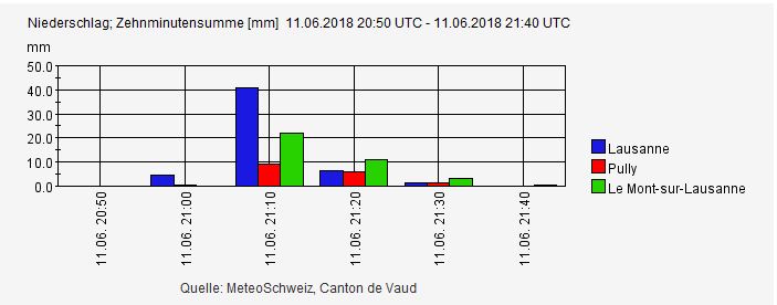 Der 10-Min-Niederschlagsrekord vom letzten Jahr (Eschenz am 02.08.2017, 36.1 mm) ist bereits wieder Geschichte. Letzte Nacht wurden an der SMN-NiME-Station Lausanne in 10 Min. 41.1 mm gemessen. Bevor jetzt jemand den Klimawandel aus der Mottenkiste holt: Diese automatischen 10-Min.-Messungen gibt es erst seit kurzem, vor allem wurde das automatische Messnetz in den letzten Jahren massiv verdichtet. Es wird also spannend in den nächsten Jahren, wie hoch diese Rekord-Raten noch steigen werden.