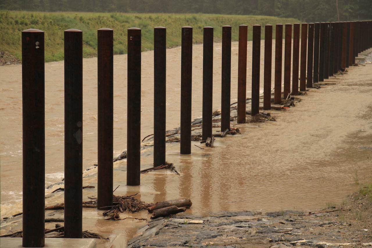 Hier noch Bilder vom neuen Schwemmholzsammler an der Sihl bei Q=80-90 m^3/s. Richtig funktionieren sollte er wohl bei höheren Abflüssen. Dazu zwei Mal die Schwelle bei Langnau a. A.