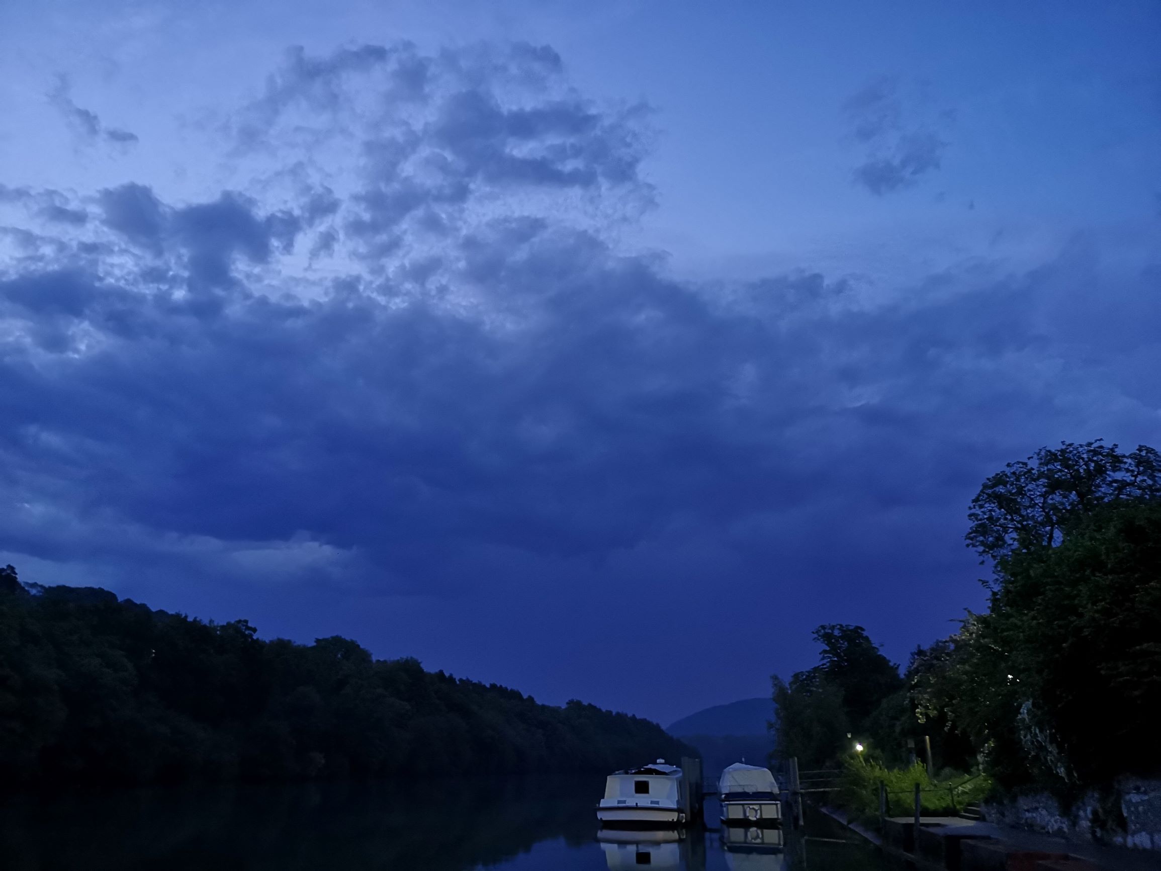 Angefangen hatte es mit leichtem Regen, der ziemlich schnell in ein Rauschen überging (Marke Sturzflut) wobei ich mir noch überlegte, ob sich ein Aufstehen und Zusehen lohnen würde. Halbherzig öffnete ich ein Auge, um zu beobachten, obs hinter dem Vorhang flackert (blitzt) und verwarf den Gedanken an ein Gewitter. Und genau dann donnerte es ziemlich heftig. Und da ich dann richtig wach war, entschloss ich mich, den Abzug des Kurz-Gewitters zu filmen :-)