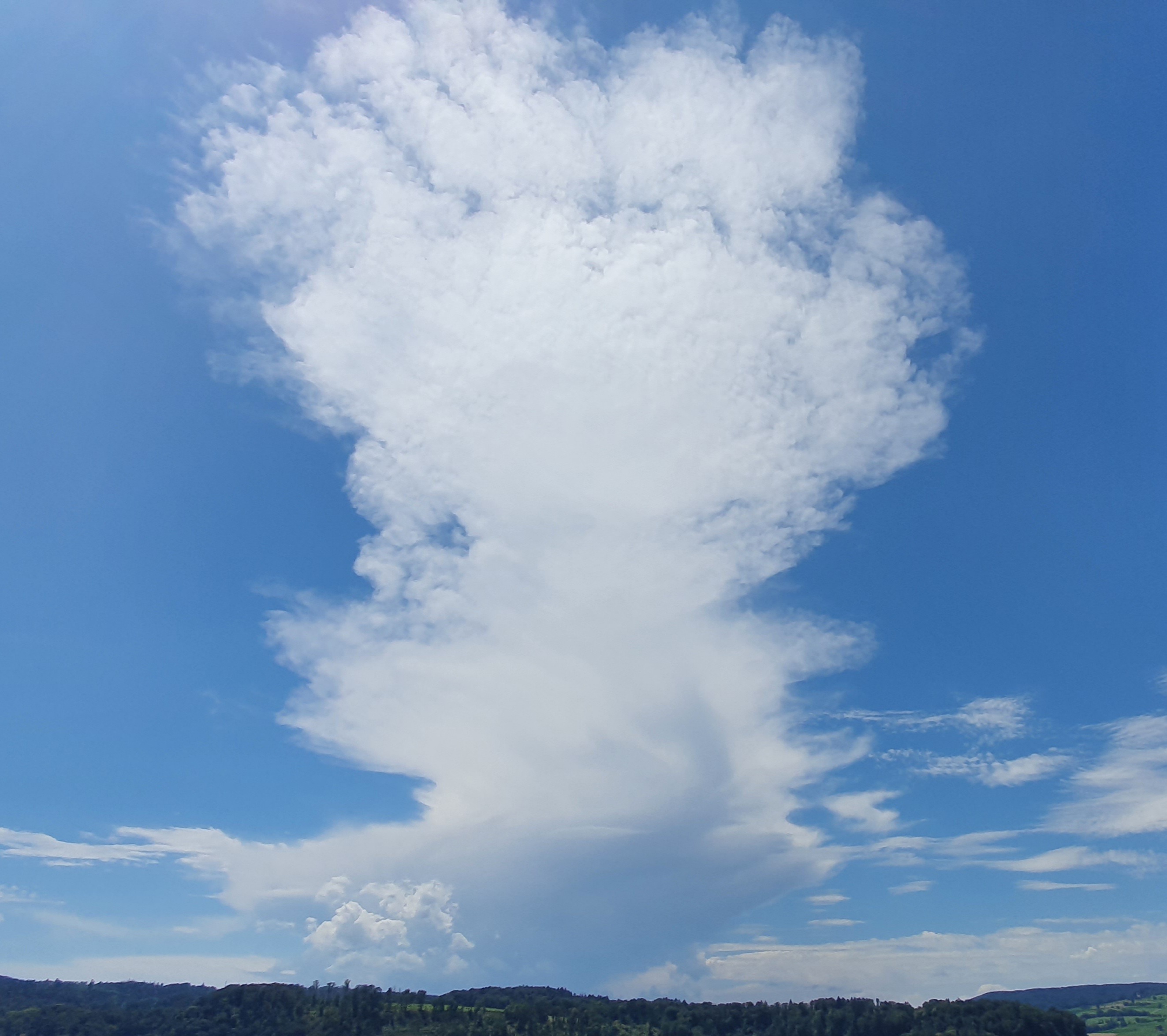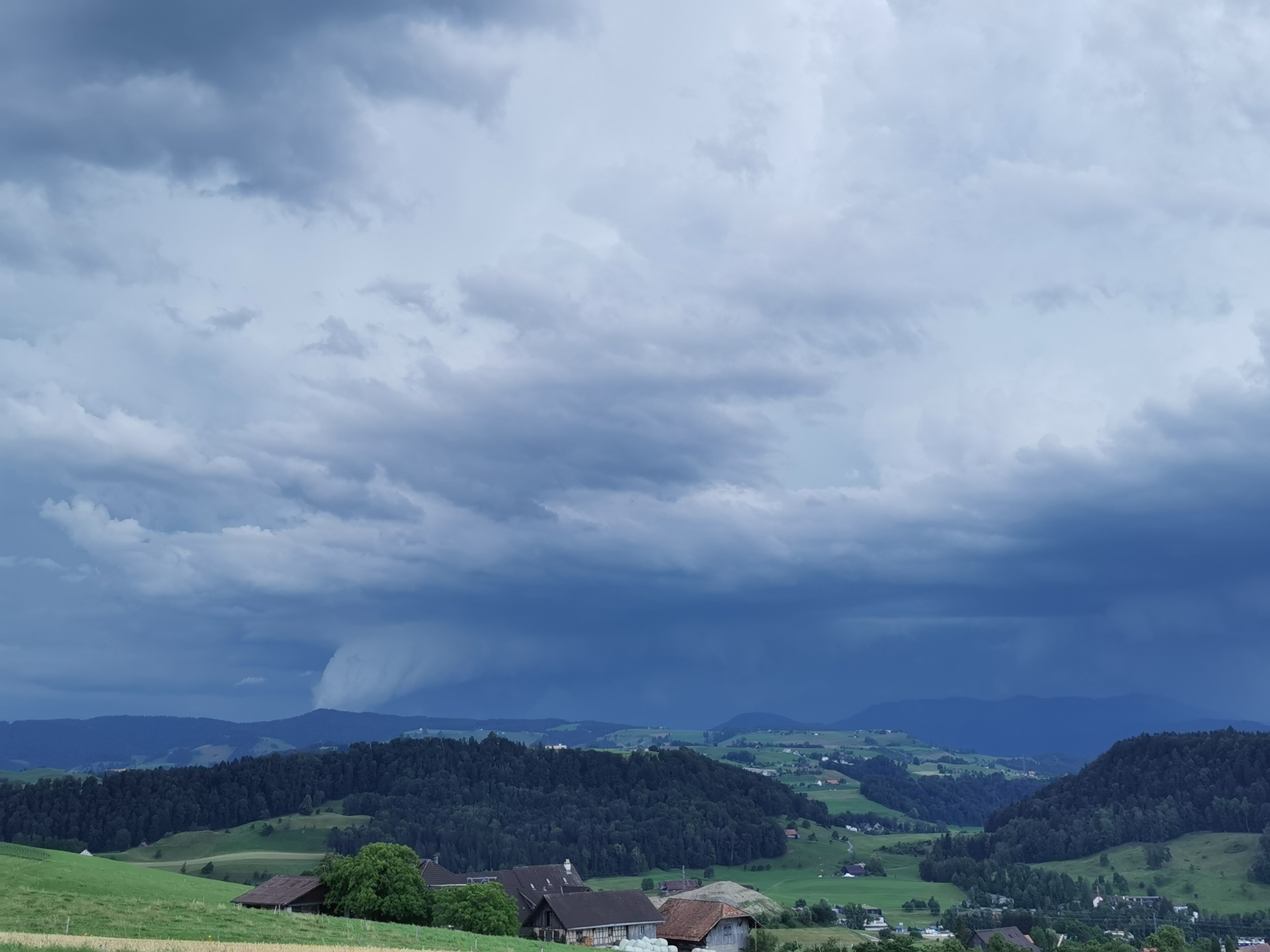 Die PAY Mittagssondierung sieht für kräftige Gewitter gut aus. Anders als in der Vorhersage von WRF hat es in der Realität auf 830hpa ein LLJ-Peak von 30 Knoten und es ist etwas labiler (ca. 1 Grad kälter auf 500hpa). Dazu ein Inverted-V Profil, was im Bereich von Gewittern wie schon erwähnt schwere Sturm- oder gar Orkanböen zur Folge haben könnte - vor allem präfrontal. Für die Bildung von grossem Hagel ist dies allerdings eher weniger gut. So wie es im Moment aber aussieht, dürfen wir uns vor allem auf eine blitzreiche erste Nachthälfte freuen, wenn von Frankreich her die Gewitterfront aufzieht.