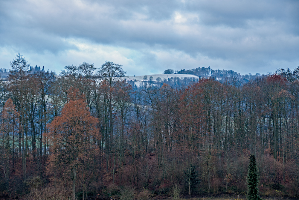 In Sellenbüren sind die Wälder bis ca. 600m angezuckert, Talboden grün aber Hausdächer weiss