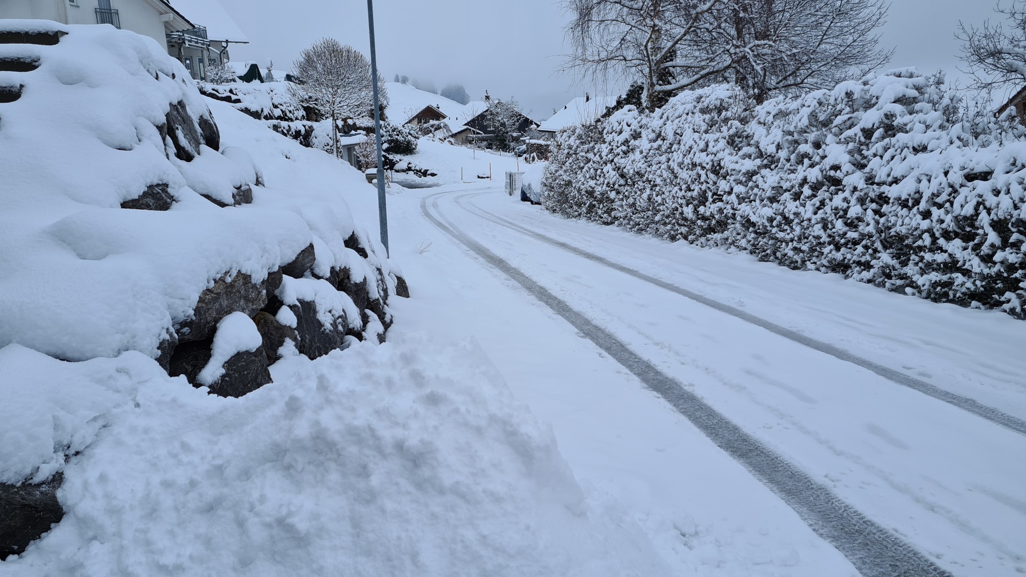 Hier auf 430 Meter über Meer an der Grenze zum Glarnerland ist wenigstens alles weiss ausser die Strassen. Aber da habe ich bei einer solchen Wetterlage eigentlich mehr erwartet. Die Niederschläge dringen ja kaum in die Alpen vor. Die verhungern schon an der 1. und 2. Voralpenerhebung...