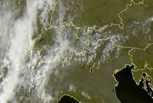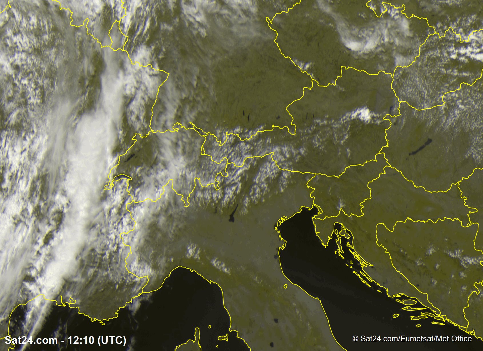 Der Feuchtetransport über die Alpen ist gut auf dem Satellitenbild zu erkennen. Hier im Grossraum Zürich hat die Sonne deshalb derzeit einen sehr schweren Stand (Quelle: Sat24):