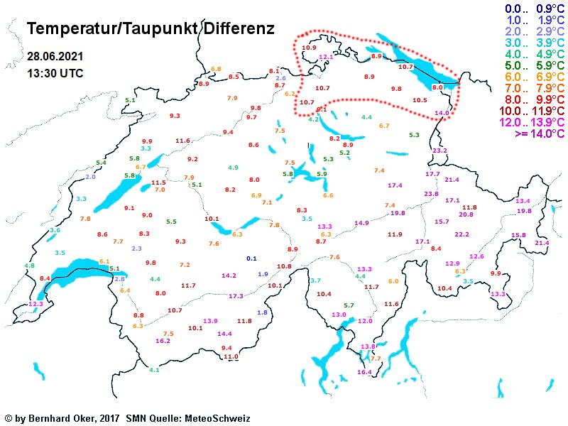 Ja, an den Voralpen ist es schon feucht, aber im angrenzenden Mittelland (Kt. ZH und TG) und auch am Bodensee ist der Spread auffällig erhöht: