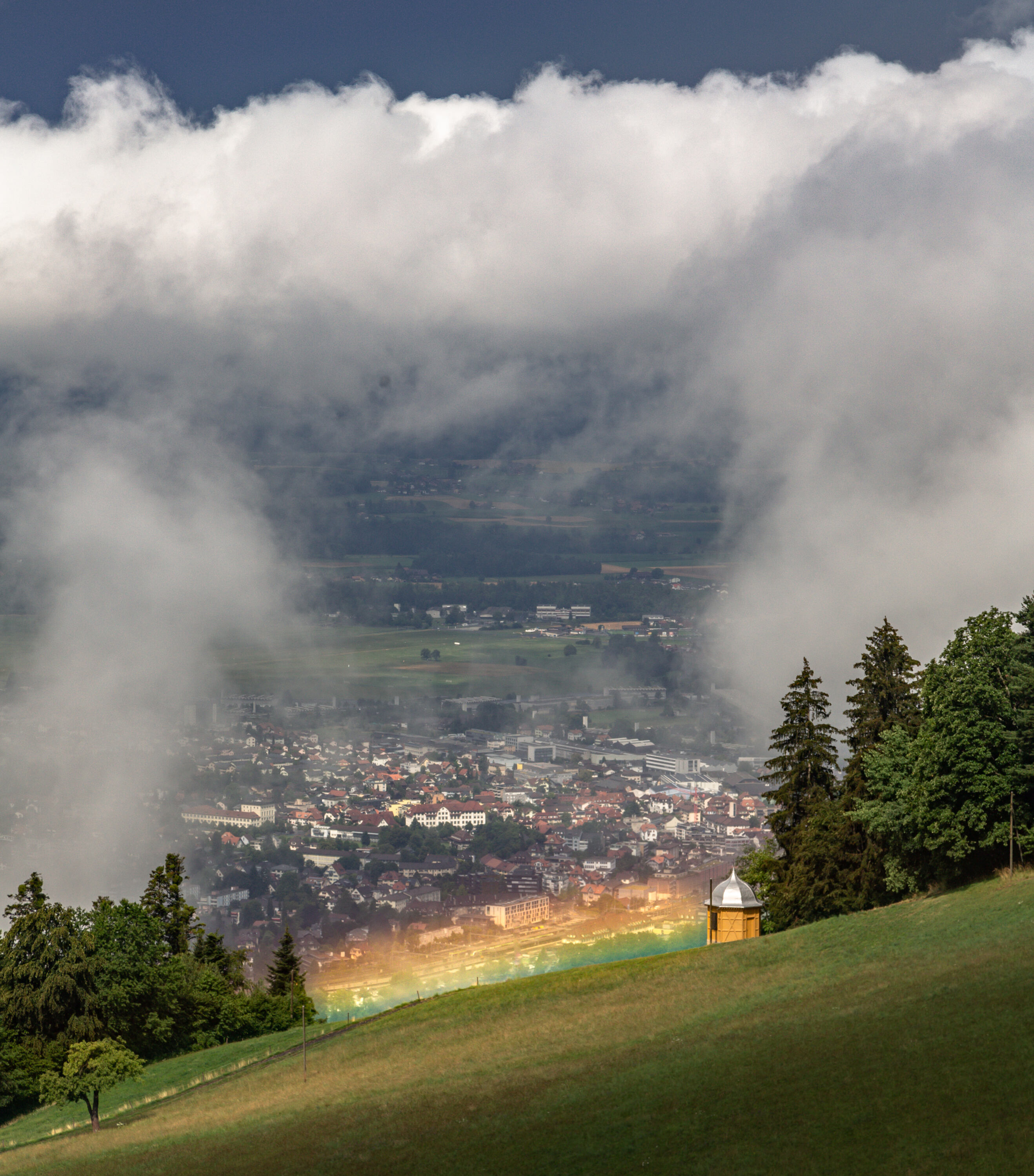Auf der Rückseite zeigte sich kurz ein tiefliegender Regenbogen über dem Bahnhof Thun: