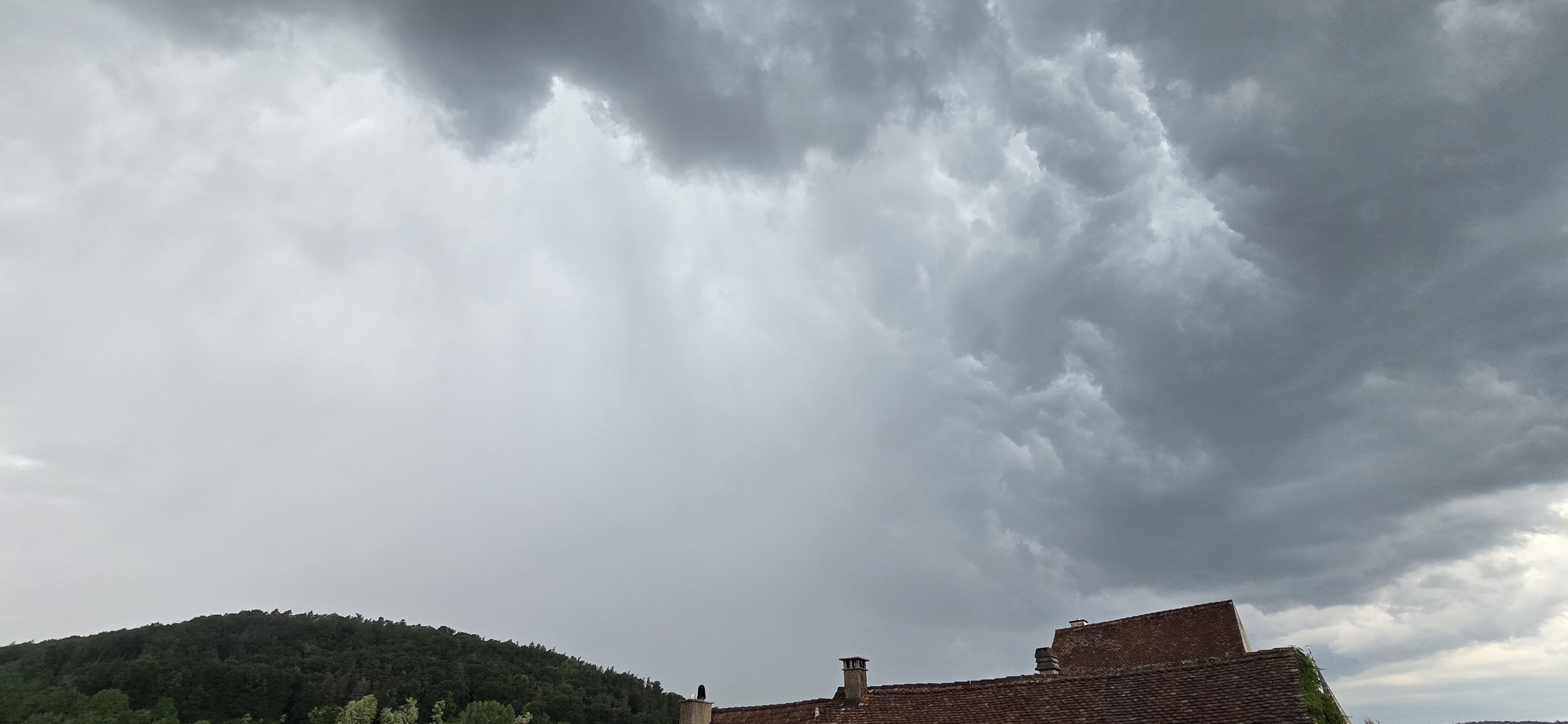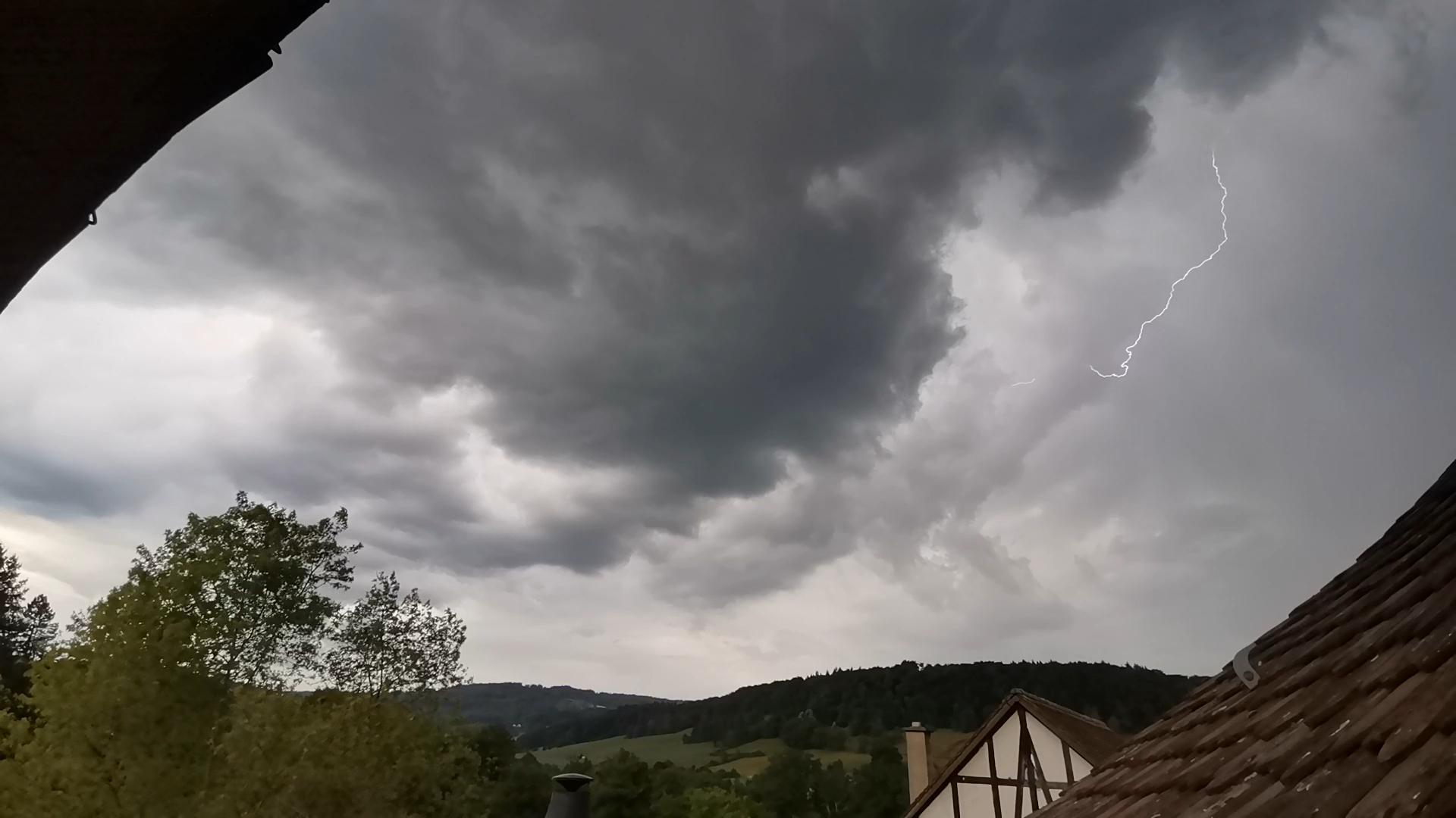 Heute hier im Südschwarzwald im Bereich der Wutachschlucht ein paar schöne Wasserbomben, die teilweise auch reichlich Hagel im Gepäck hatten. Korngröße aber moderat, nicht mehr als 1,5 cm.