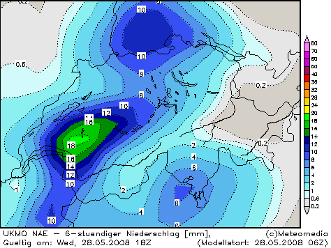 Das UKMO NAE der Meteocentrale hat nun von Lauf zu Lauf die Niederschläg für heute Abend in der Nordostschweiz verstärkt.