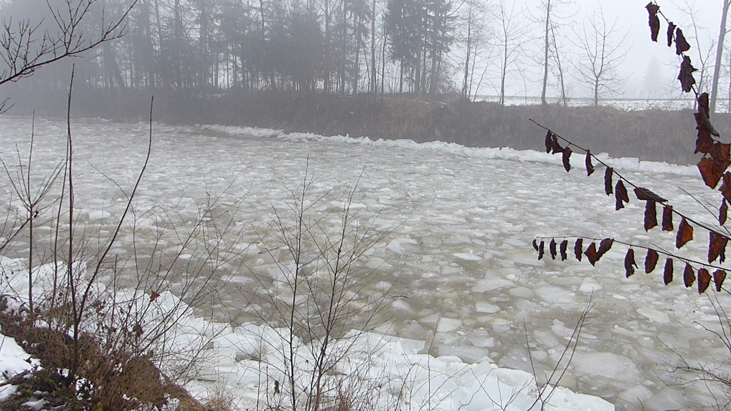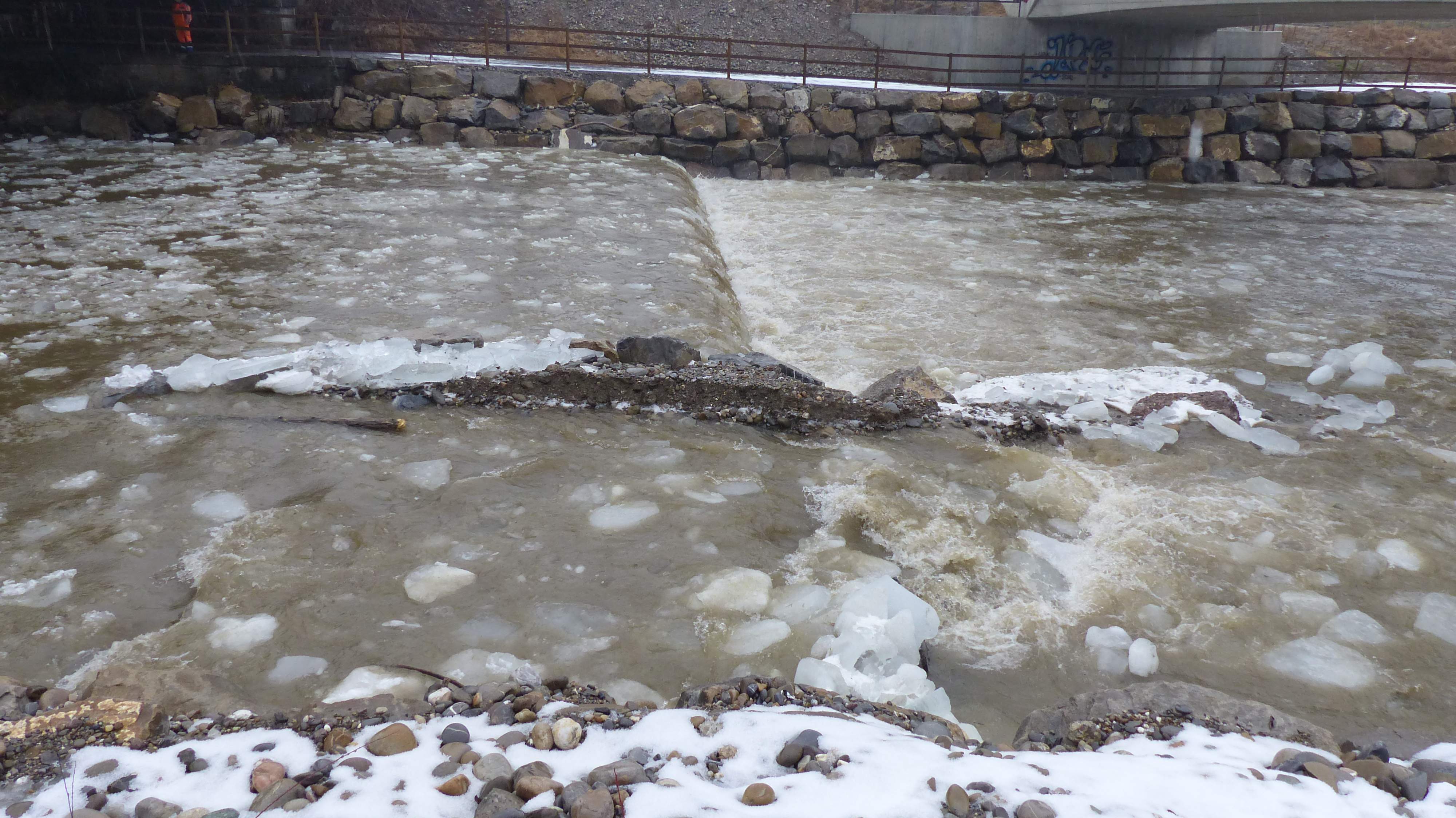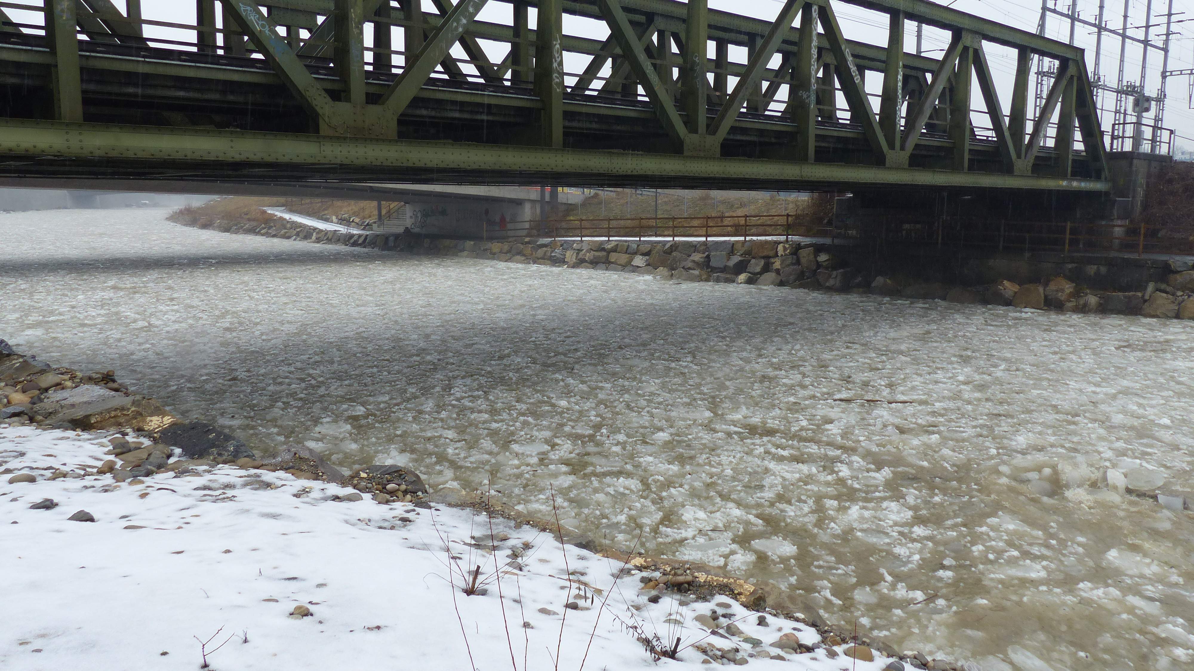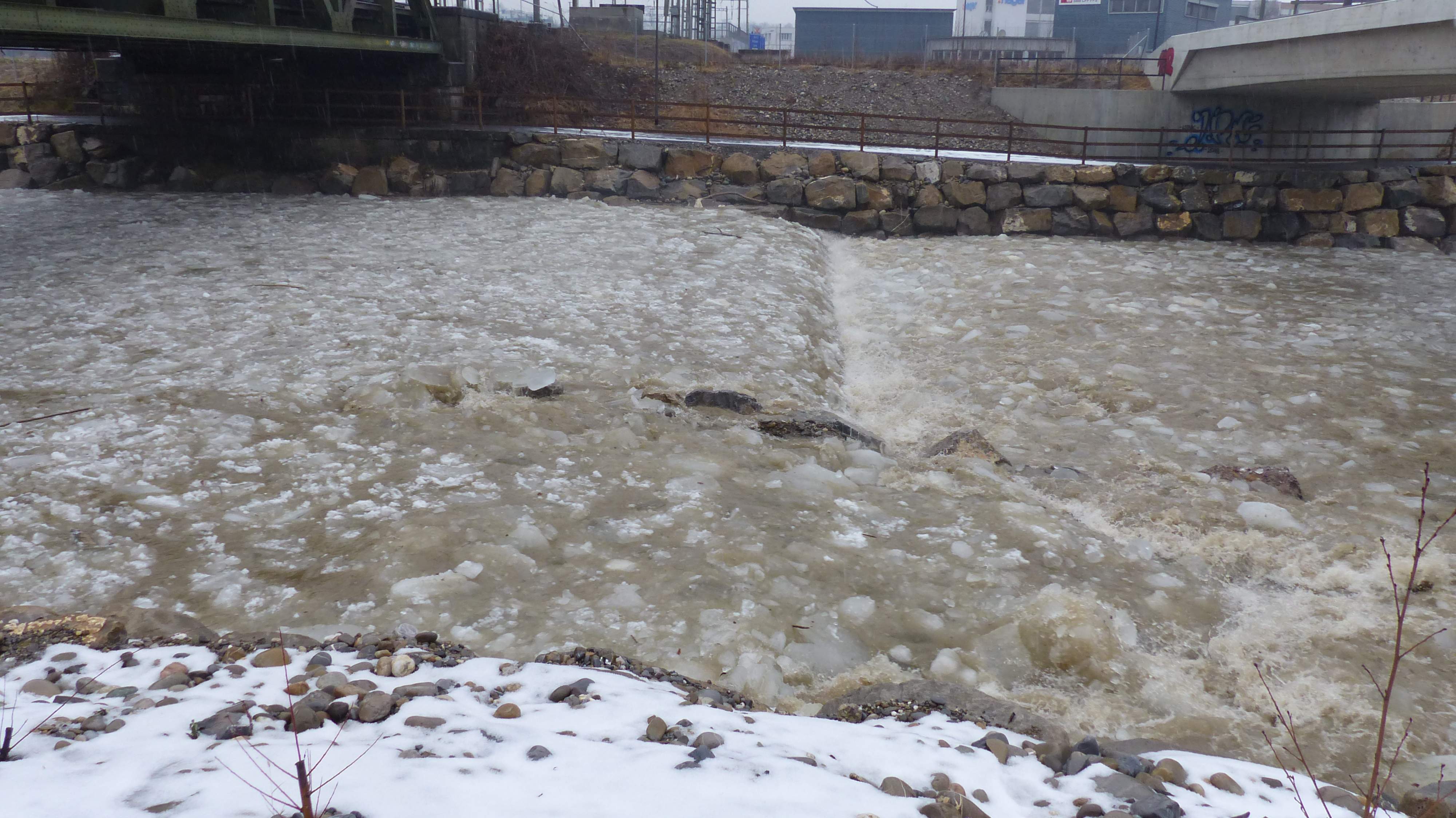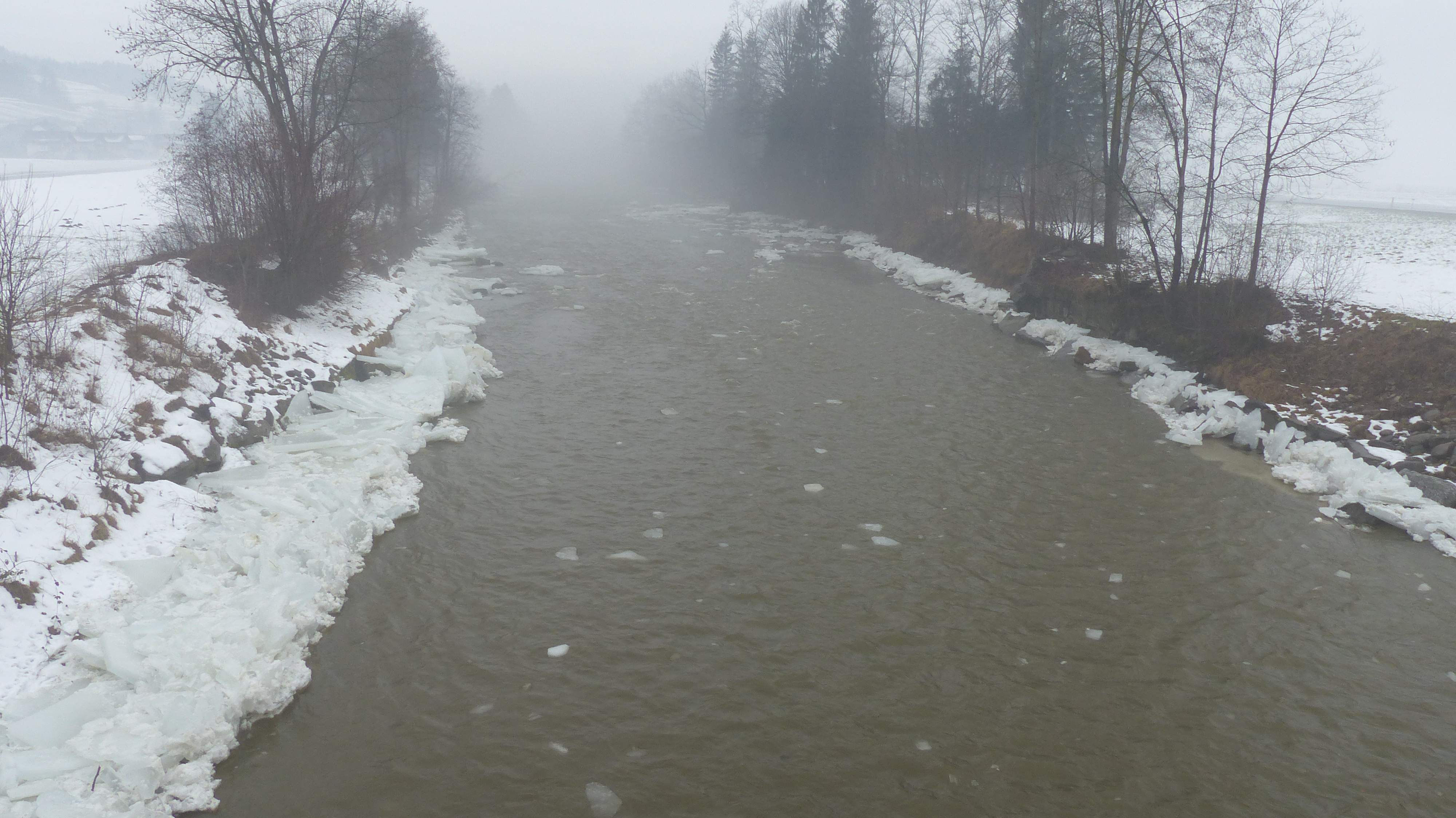 Etwas später um 12:11 Uhr ist der Pegel etwas gestiegen. Es kommen jetzt etwas mehr Eisschollen.