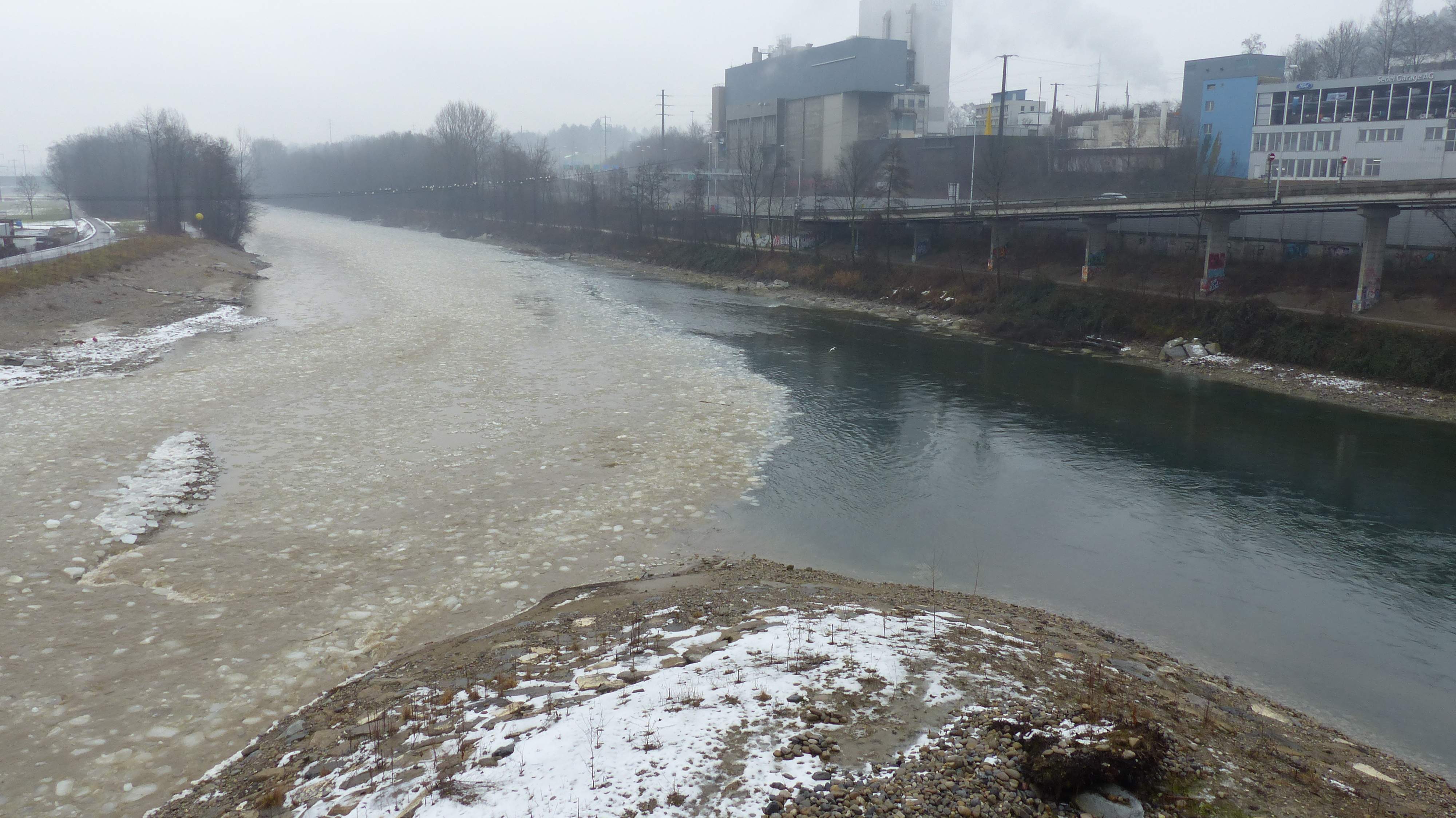 Ich verfolgte dieses Hochwasser. So wie es aussieht gab es zwei Schübe mit Eis, wobei ich der zweiten Welle folgte. Weiter Flussabwärts etwas oberhalb der Einmündung in die Reuss kam ich knapp zu spät an um die erste Welle zu dokumentieren.