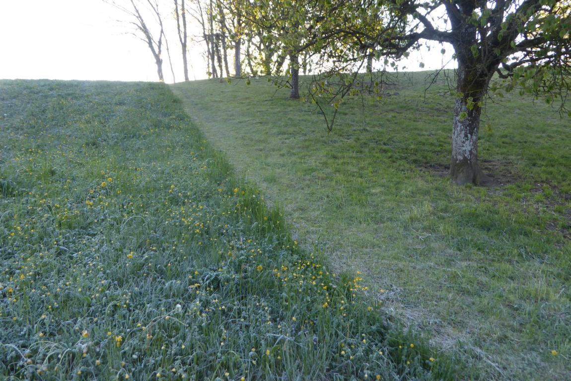 Auf diesem Bild sieht man das Phänomen sehr gut. Im hohen Gras ist alles voller Reif. An der Grenze hat es zuerst noch mehr Reif auf dem abgeweideten Stück, danach, deutlich weniger. Ebenfalls auffällig war, dass an kleinen Hügeln die Nordostseite (zur Bise hin gerichtet) auffällig stärker gefroren war.
