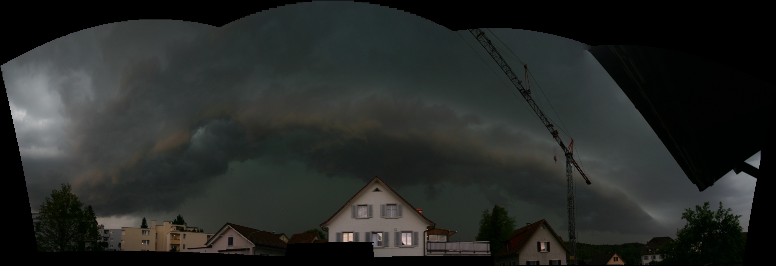 Das war ja unglaublich. Ich habe mich beim Tägerwilen-Dorf Bahnhof verschanzt und habe mich vom Gewitter überrollen lassen. Das war echt umwerfend! :shock: Es wurde bedrohlich dunkel und es wehte kein Lüftchen. Die Böenfront rollte langsam auf mich zu. Plötzlich legte der Wind los. Mein Fahrrad wurde umgeworfen, die Glastür vom Bahnhof wurde beinahe eingedrückt. Laub und Geäst flogen durch die Luft. Dann kamen die ersten schweren Tropfen. Wenig später "schütt" :schirm: