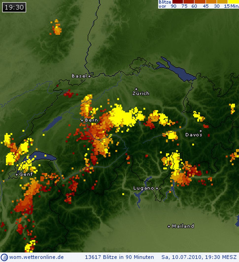 Ich wahr heute leider an einer Hochzeit in Glattfelden und kriegte von den Gewittern nicht viel mit, erst gegen 21.30 kahm aus Westen ein Gewitter auf uns zu blieb aber ein par km von mir entfernt stehen und ich sah blos ein paar Blitze